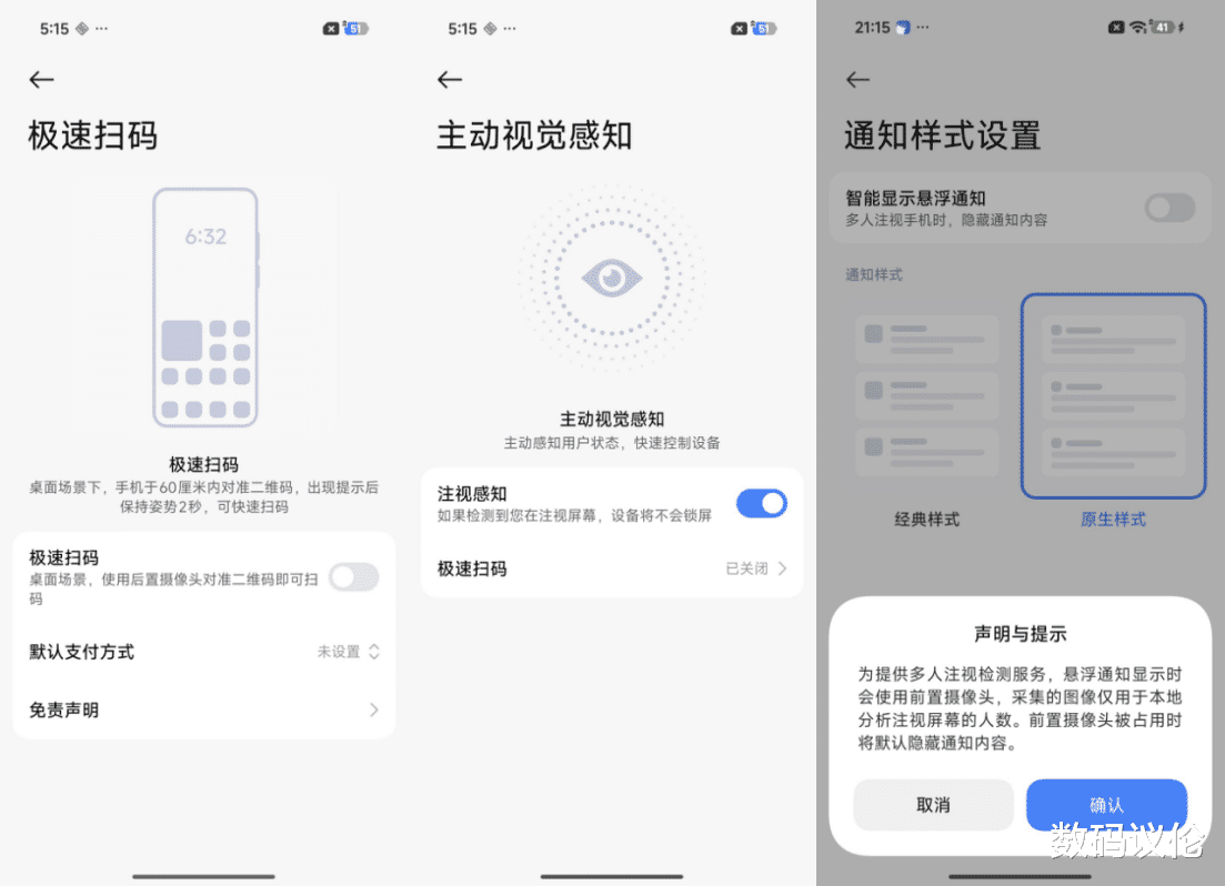 由于支持了低功耗摄像头常开,也就可以实现主动视觉感知、极速扫码、悬浮通知智能显示这些智能感知的功能——包括前文提到的AOD智能显示。