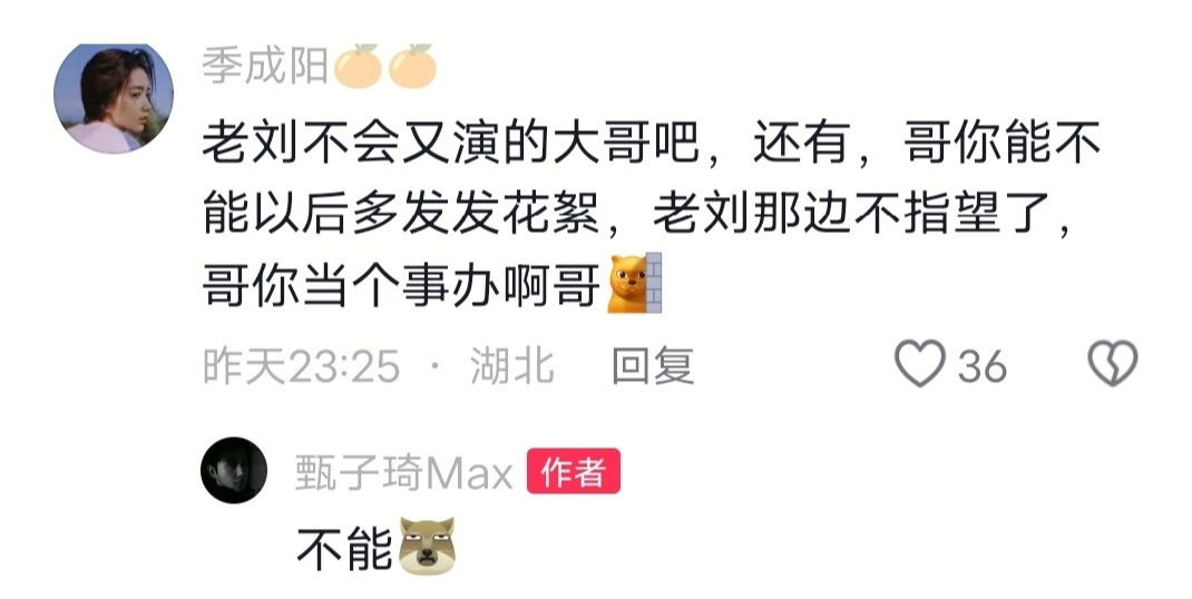 有粉丝说是刘萧旭不光嘴硬,还嘴严,让甄子琦以后多发点花絮,刘萧旭是指望不上了。结果,甄子琦一口回绝。