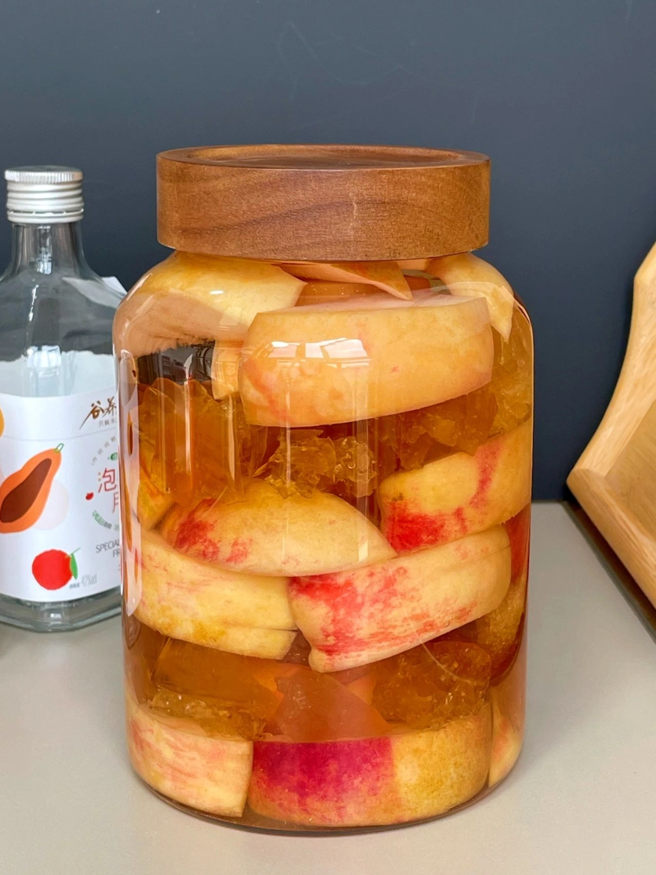 准备:水蜜桃、冰糖、粮食酒、玻璃泡酒罐/密封罐