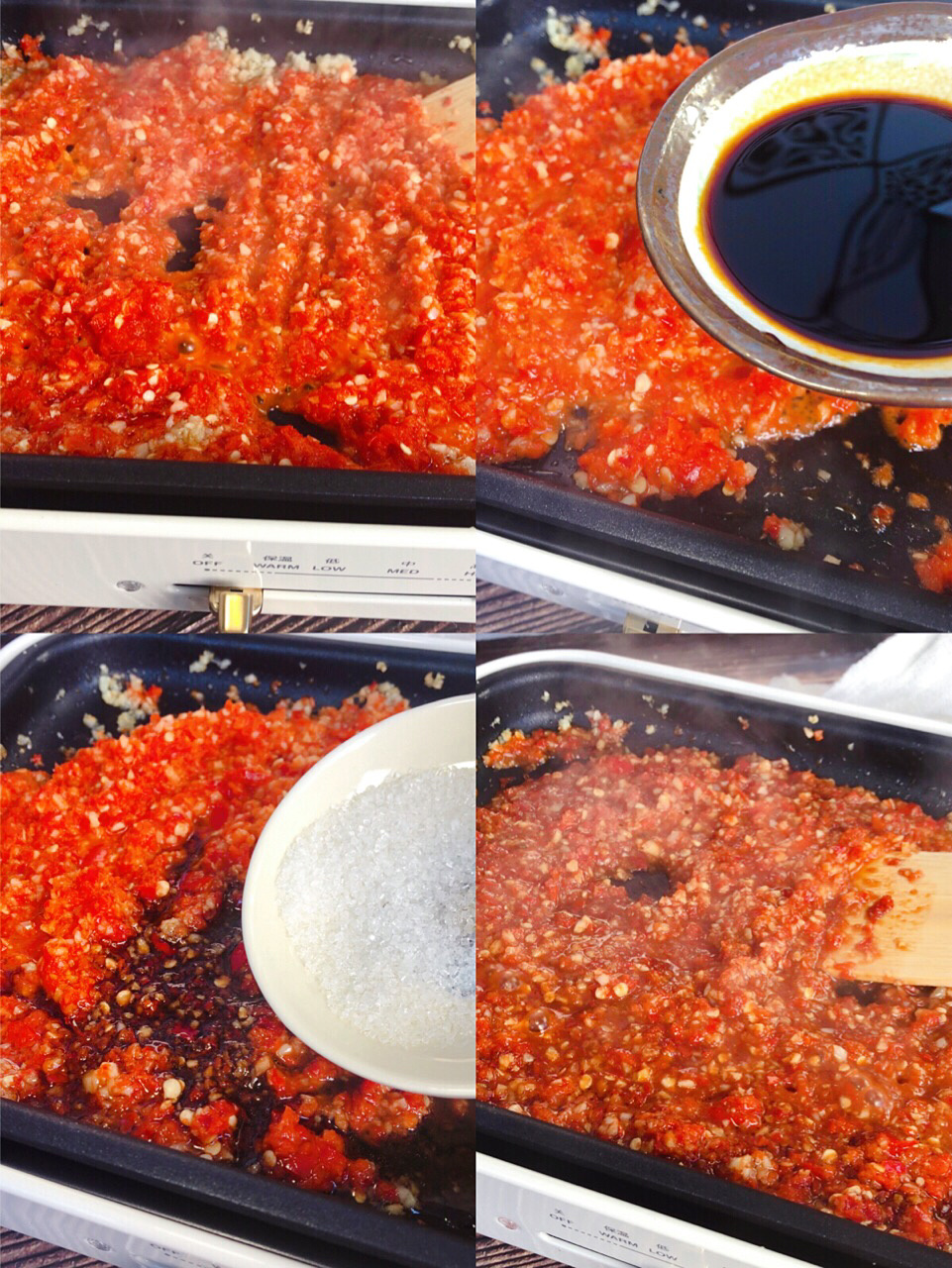 ??材料:红辣椒5个、蒜头3个、生抽2勺、盐1勺、白砂糖2勺