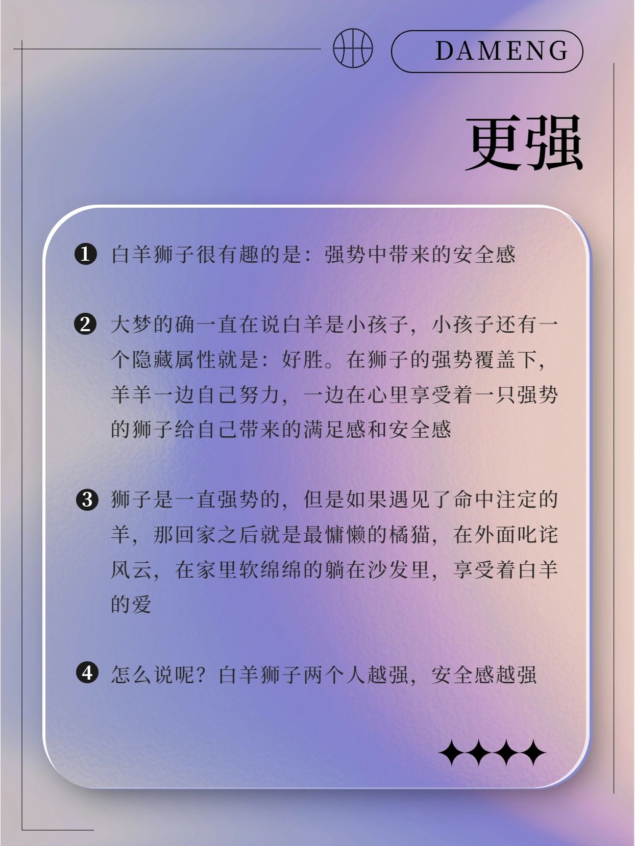 大梦的确一直在说白羊是小孩子,小孩子还有一个隐藏属性就是:好胜。在狮子的强势覆盖下,羊羊一边自己努力,一边在心里享受着一只强势的狮子给自己带来的满足感和安全感