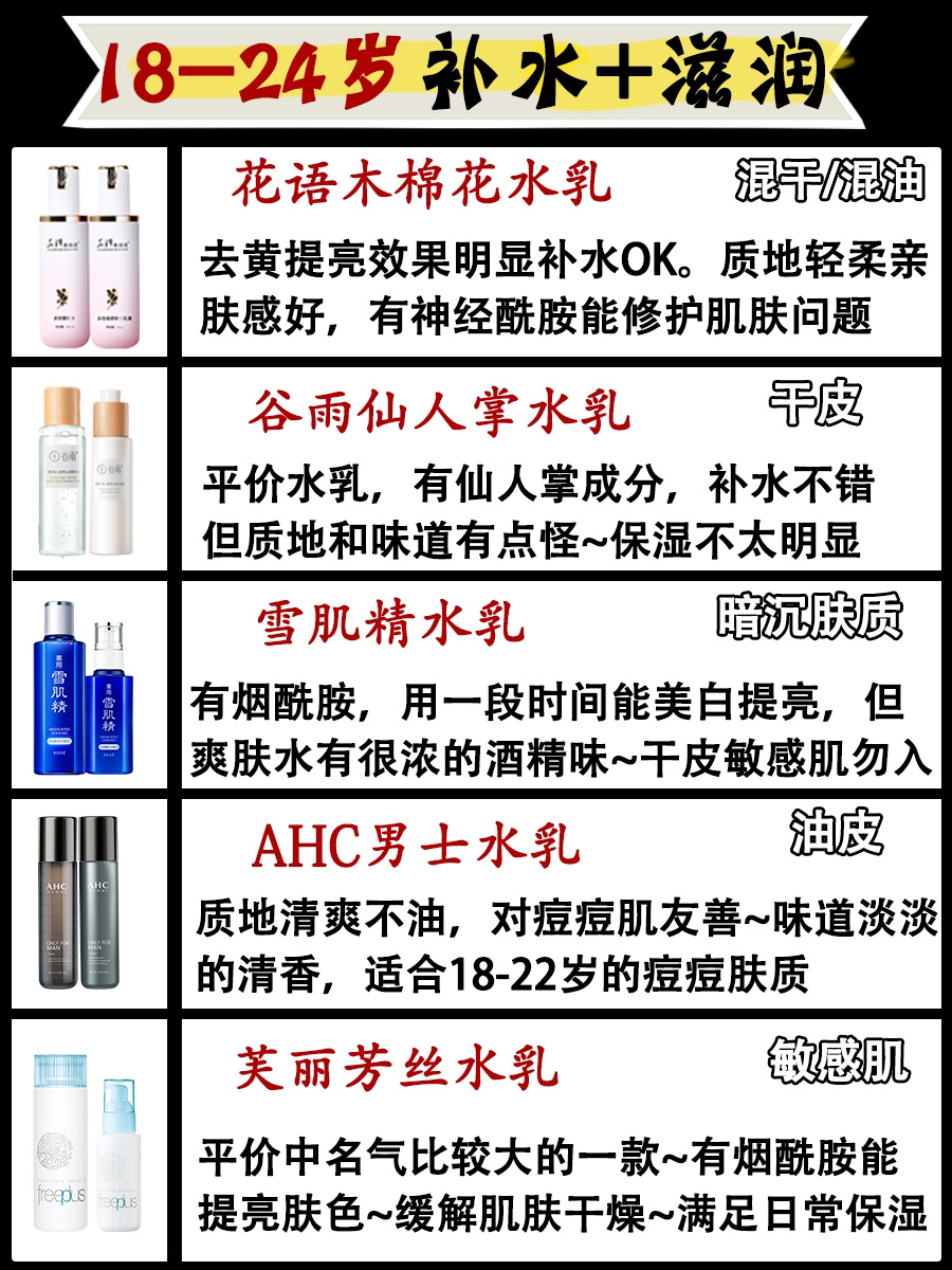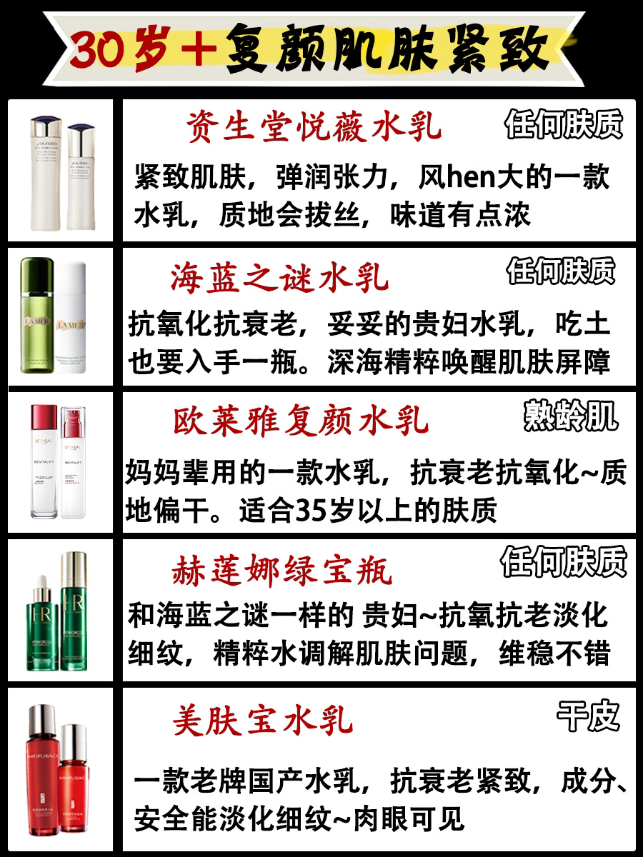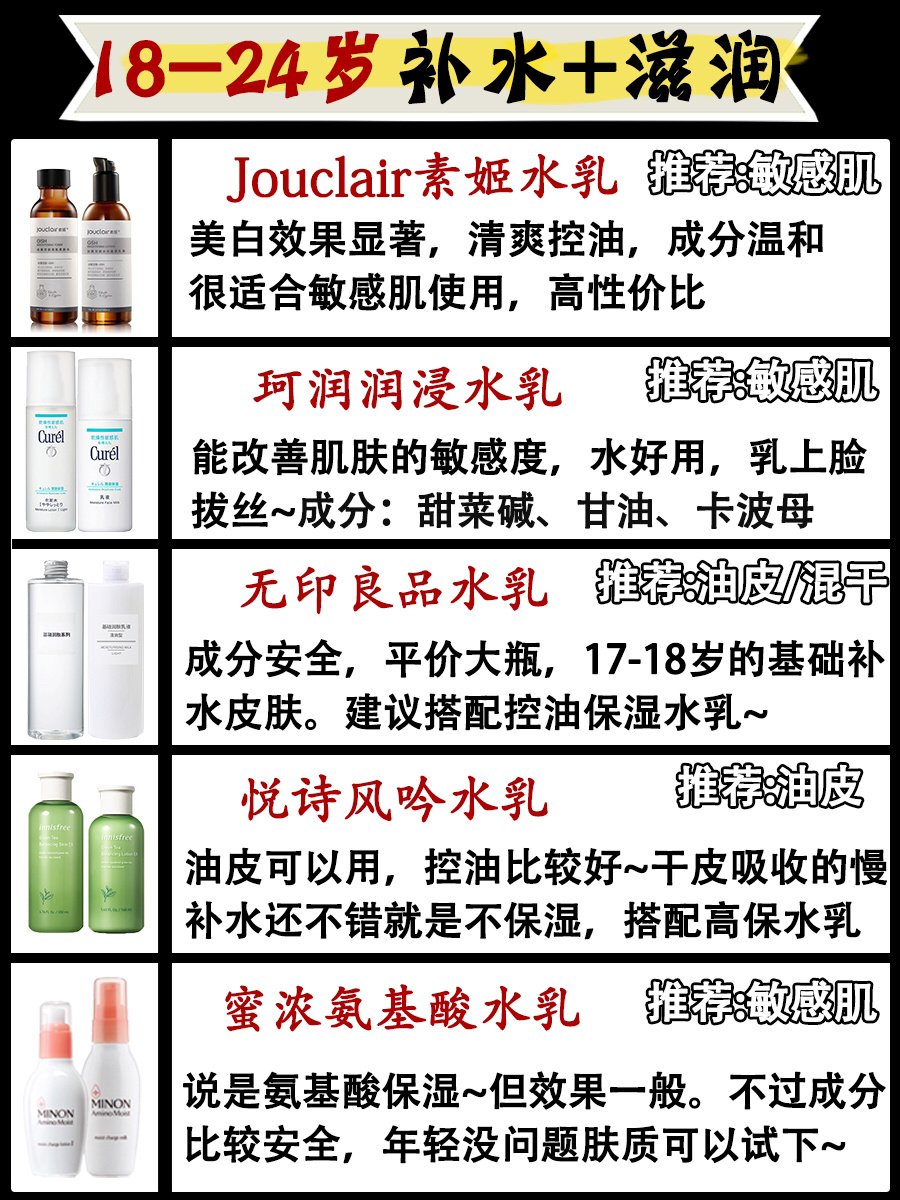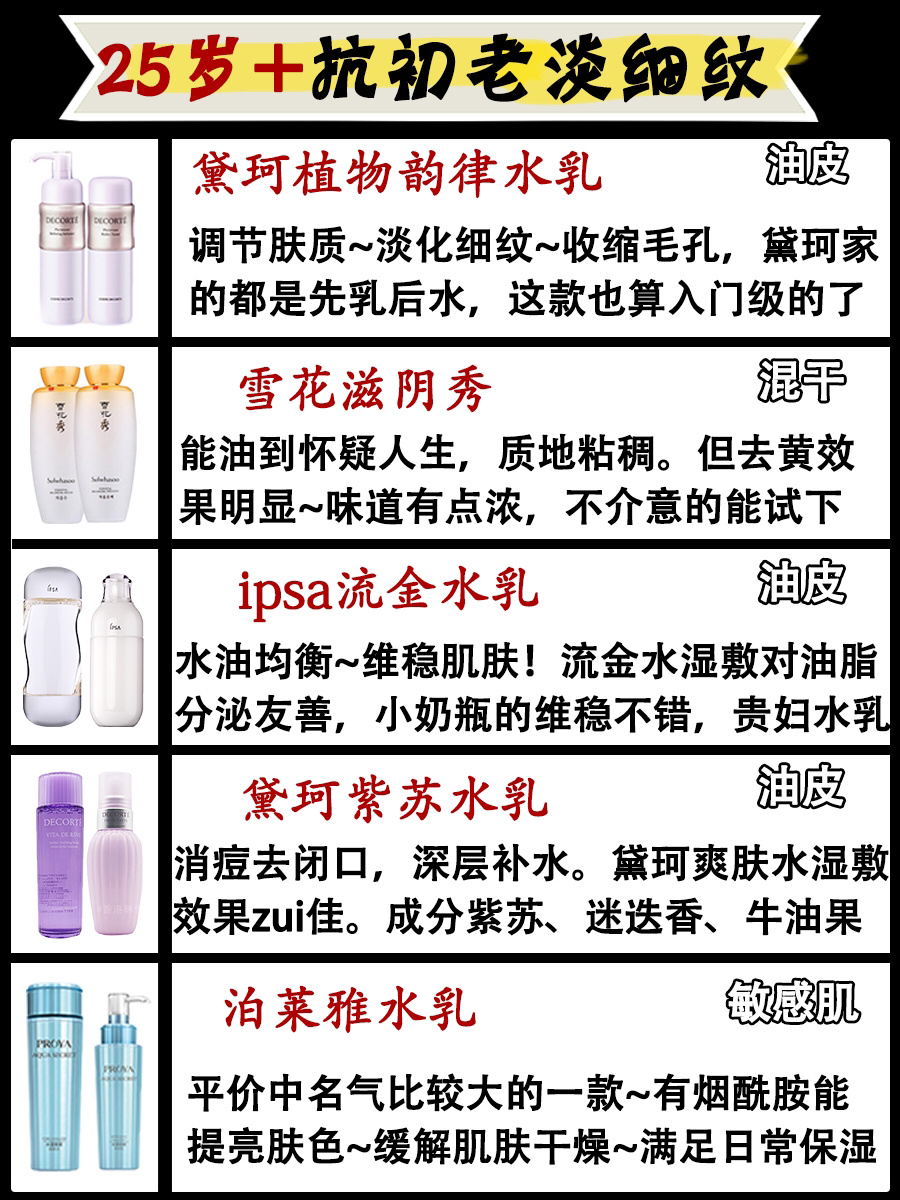 同年龄的水乳测评去细纹抗初老不踩雷 都说水乳用的越早越好,但具体的年龄该用什么水乳小仙女们又不清楚 所以为了方便大家,一目了然的看到适合自己的水乳,今天把我以前用过的水乳整理了一下,从各个年龄段细分一下 - 抗初老在护肤江湖中由来已久,有的法令纹出现的早,在抗初老上就会早点。年龄也是只是一个参考,具体的还是要根据皮肤当时的情况来决定 好了详细的都在上面呢,保湿水乳/干皮水乳/平价水乳/敏感肌水乳/