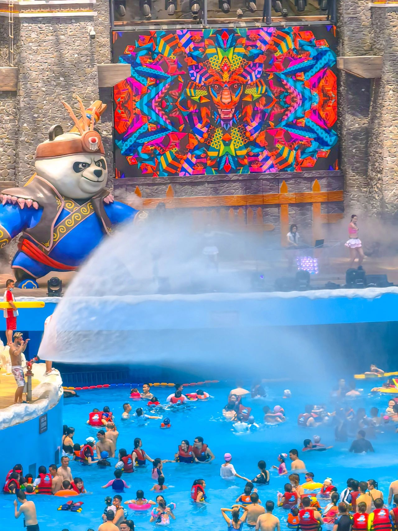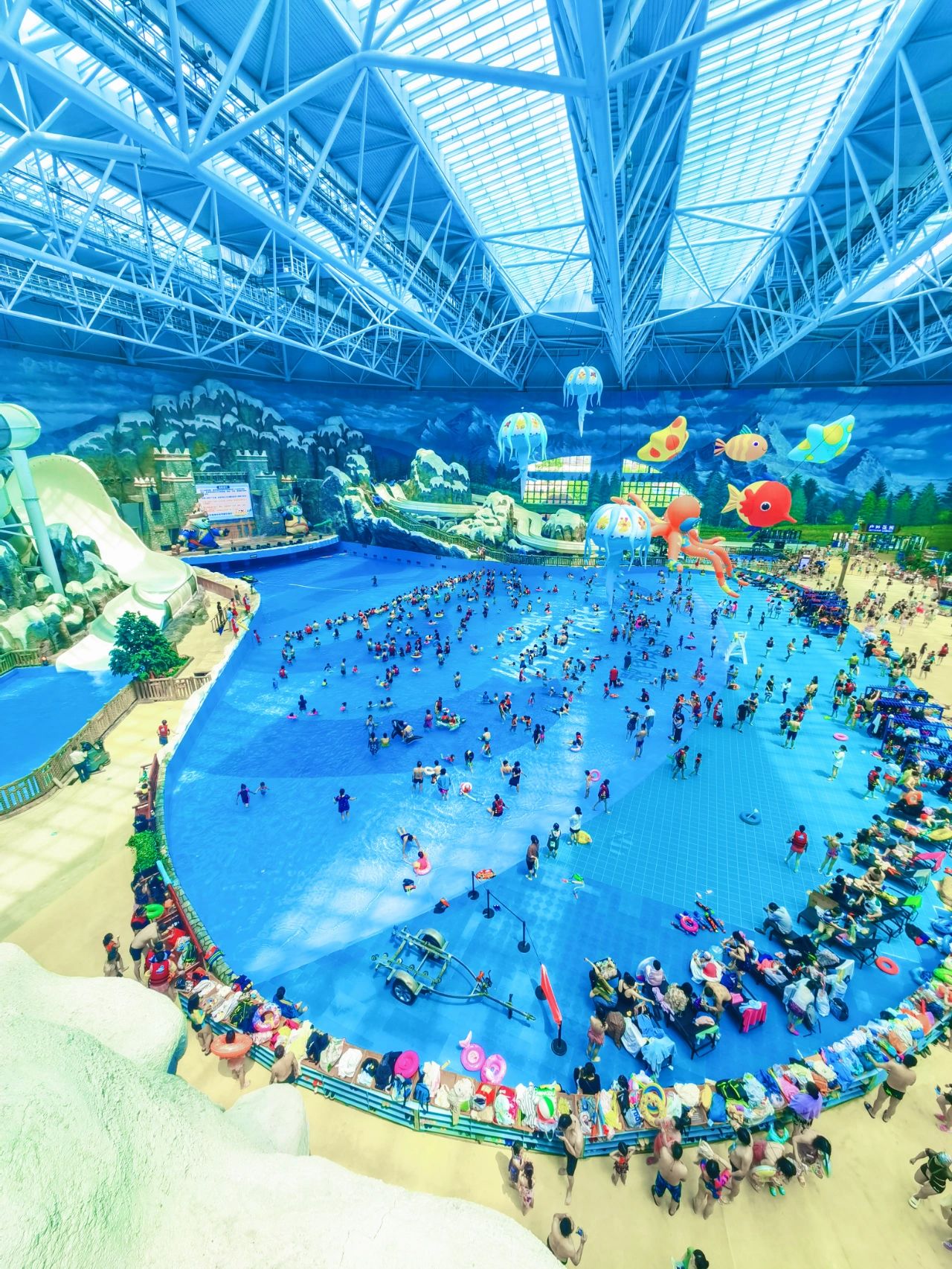 💎这是唯一一个室内的水上乐园,不晒是它最大的亮点,里面是西羌主题,各种熊猫和雪山的远景成为远景。