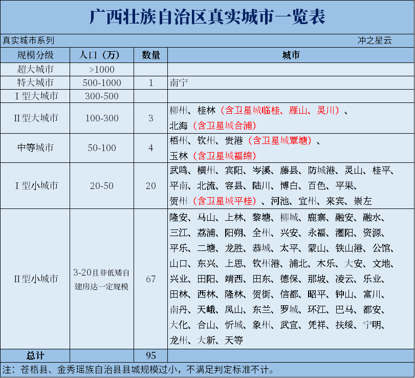 经判定统计,广西壮族自治区共有95座建成区独立、完整的真实城市,海南省有27座。广西的苍梧县、金秀瑶族自治县驻地规模过小,达不到城市的判定标准,在此不计。海南省三沙市及下属各区性质特殊,且规模过小,在此不计。