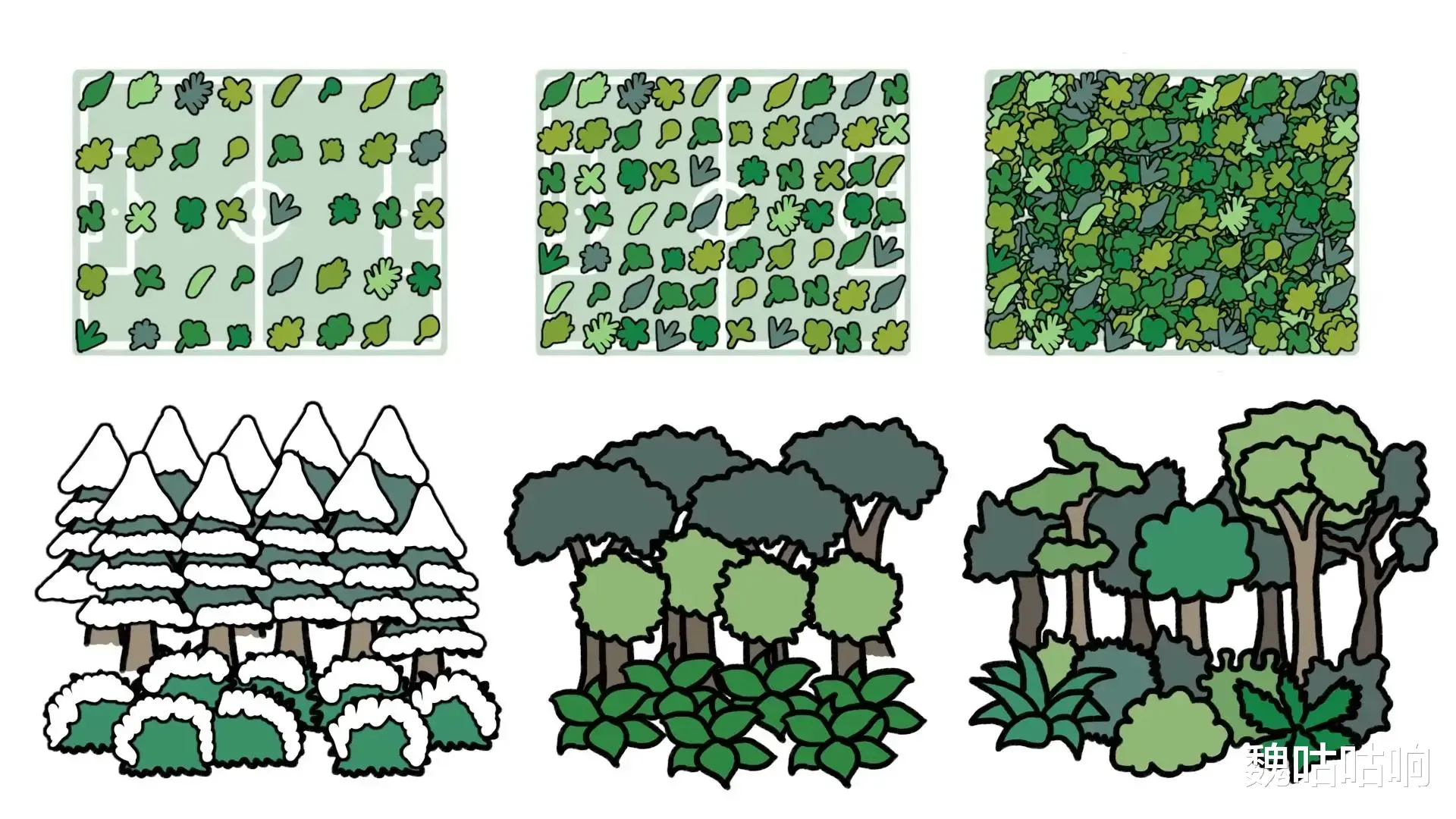 富饶的陷阱与贫瘠的机遇如果我们对不同纬度的生态系统进行抽样调查,会发现一个惊人的梯度规律:在寒冷的阿拉斯加,一块足球场大小的森林约有40种植物;在温带的英国,这一数字提升至70种左右;而到了亚马逊雨林,同等面积内的植物物种数量会激增至300种。