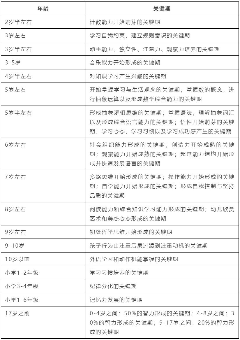 当然,关键期是一个相对的阶段性概念。意大利著名教育家蒙安台梭利提出的婴幼儿的九大敏感期非常值得父母借鉴。这九大敏感期分别为:语言敏感期(0-6岁)、秩序敏感期(2- 4岁)、感官敏感期(0- 6岁)、对细微事物感兴趣的敏感期(1.5-4岁)、动作敏感期(2-6岁)、社会规范敏感期(2.5-6岁)、书写敏感期(3.5- 4.5岁)、 阅读敏感期(4.5-5.5岁)、文化敏感期(6-9岁)只要父母多关心孩子的成长,多关注孩子的兴趣变化,肯定能发现孩子在敏感期到来之际的变化。