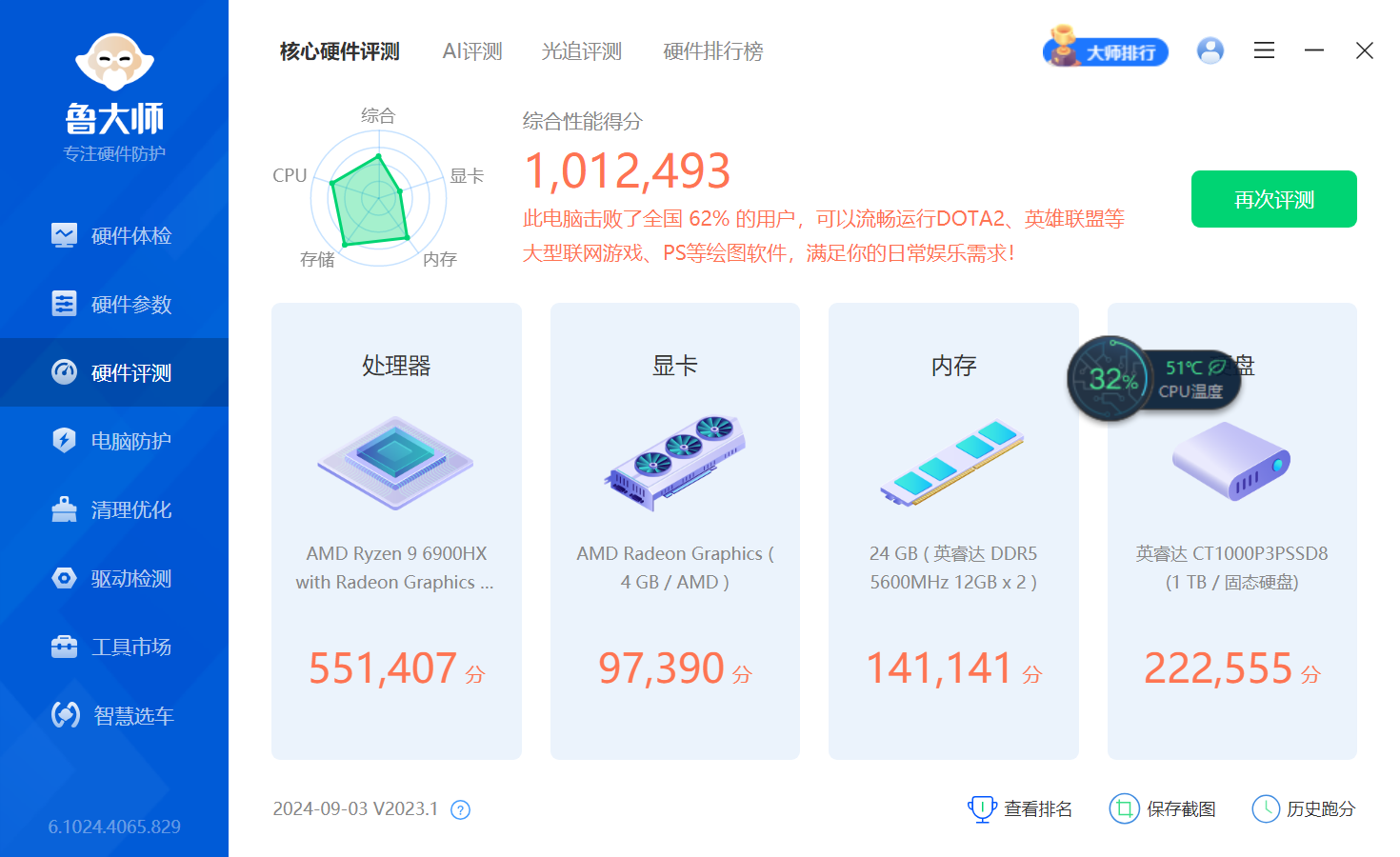 而在2024年最新版鲁大师核心硬件评测中,其核心硬件评测得分非常喜人,高达1012493分(基于默认TDP 45W测试)。