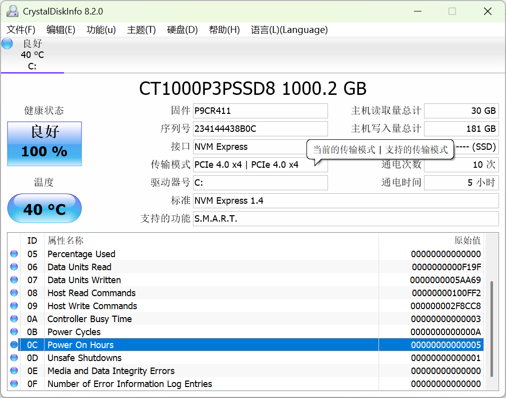 本机标配英睿达1TB NVMe 高速大容量固态硬盘,支持规格为PCIe 4.0×4超高传输协议,可以看到【当前的传输模式】已经达到PCIe 4.0*4。