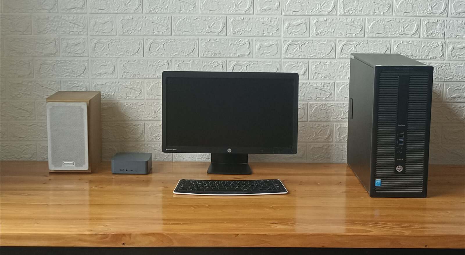新旧两台电脑摆在一起,这下终于明白为啥右边的台式机叫塔式电脑了。零刻EQR6精致小巧,一眼望去,你很容易忽略它的存在。