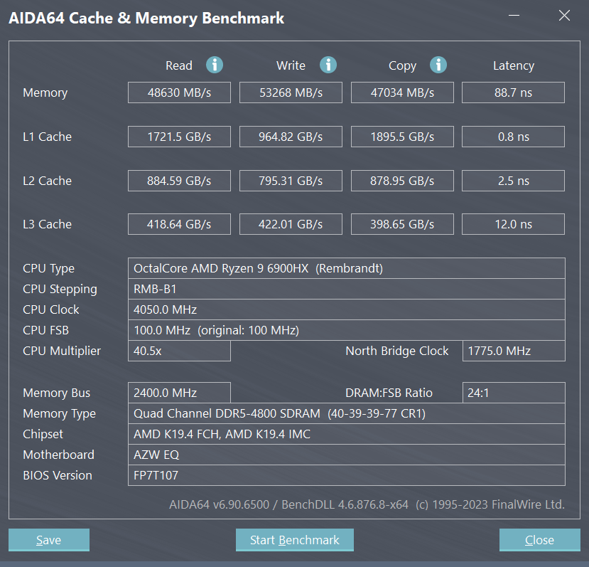 在AIDA64的内存和缓存基准测试中,零刻EQR6迷你主机展现出了惊人的性能:内存读写速度分别高达48630 MB/s和53268 MB/s。如此高速的内存带宽,意味着程序和文件的加载速度将大幅提升。无论是处理复杂的Excel表格、编辑高清图片,还是进行视频剪辑,EQR6都能迅速响应,显著提高工作效率。