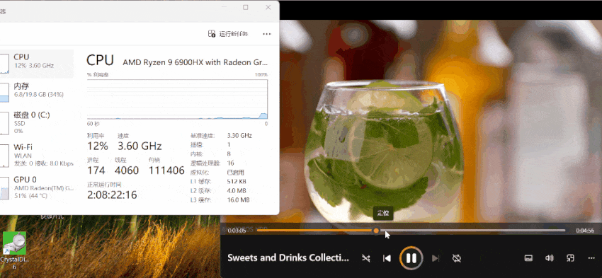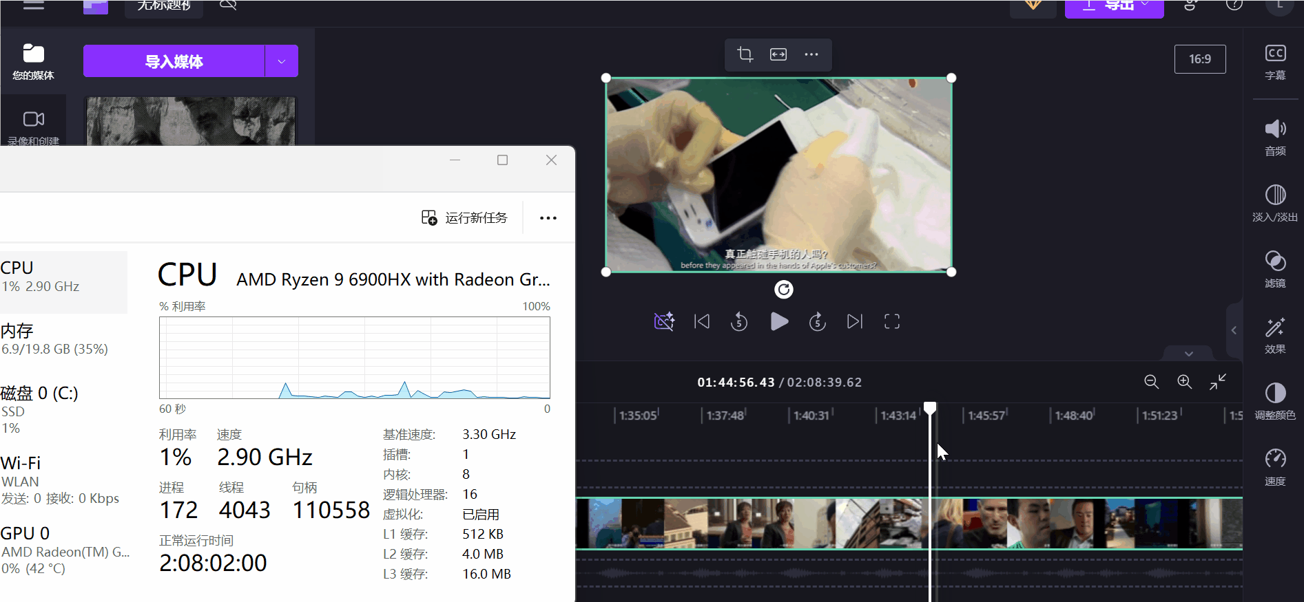 体验 - 视频剪辑 多任务处理在桌面办公的实际表现中,我们先在视频剪辑软件中打开一个视频随意拖动素材,可以看到镜头切换非常顺滑,同时在屏幕左下角同步展示了任务管理器-性能页面,可以看到CPU占用率在5-14%之间浮动、内存占用率也只有35%左右。