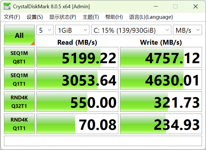 其中,SEQ1M Q8T1测试结果反映了硬盘在多线程、大数据量传输场景下的性能,而SEQ1M Q1T1测试则更能体现单线程应用的实际体验。高达5199 MB/s的顺序读取和4757 MB/s的顺序写入速度,以及3053 MB/s和4630 MB/s的单线程读写速度,充分证明了这款SSD在处理各种工作负载时的强大实力。
