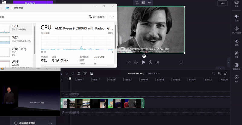 在视频剪辑软件中,我们打开一个乔布斯传记的高清影片,在时间轴上自由跳转。