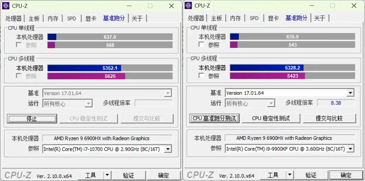 在CPU多线程分数对比中,对前者是5352分:5625分,仅相差4%;对后者则是5328分:5423分,仅仅相差1%,说明性能上差别都很小。