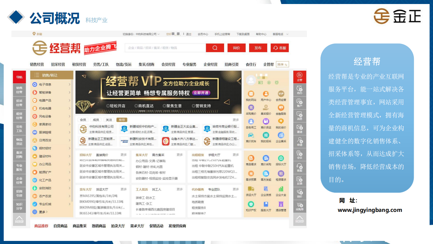 首先来看看我们的经营帮平台,该平台作为全国首家综合性贸易平台,以大数据和人工智能技术为基础,整合全产业链资源,能一站式解决商品销售、商品采购、智能招标、集采团购、劳务工队、租赁经营、物流货运、招商引资等企业各类经营管理事宜。