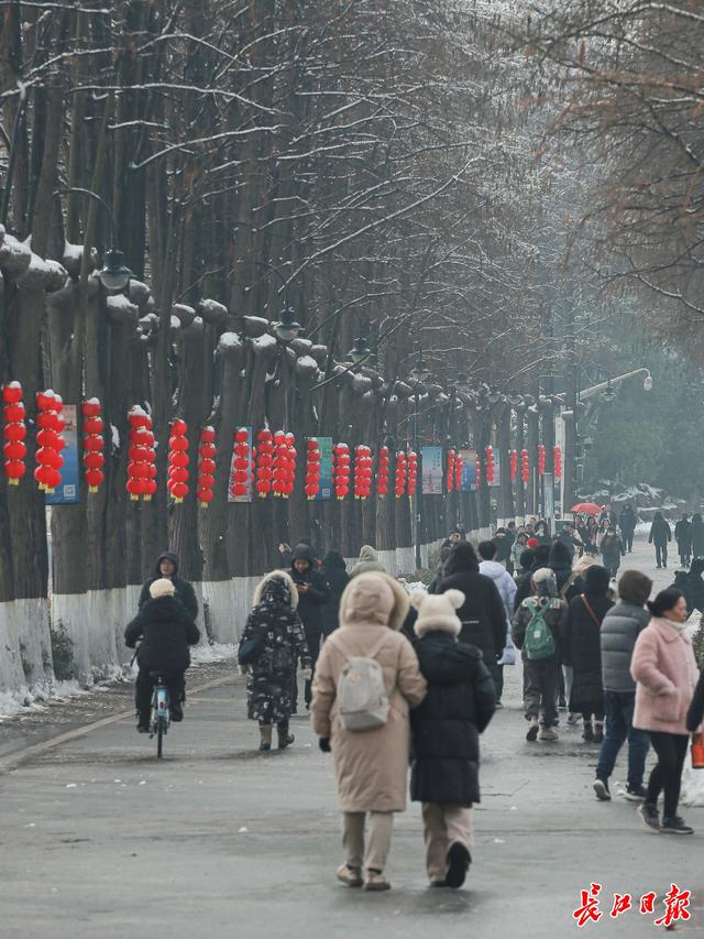 雪霁天晴,春节来临,东湖风景区各处都挂上红灯笼,春节氛围浓烈。从梨园广场来到东湖听涛景区,首先映入眼帘的是三个一组的红灯笼错落有致地挂在树枝上,三五成群的市民游客从树下走过,脸上洋溢着幸福的笑容。