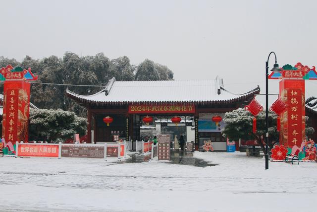 在东湖磨山景区,年味最浓的当数东湖梅园。记者看到,在东湖梅园大门口处,“红梅万树一齐开,且喜东湖春早到”的喜庆春联。梅园大门口附近,一串串红灯笼挂在树枝上,红彤彤一片。