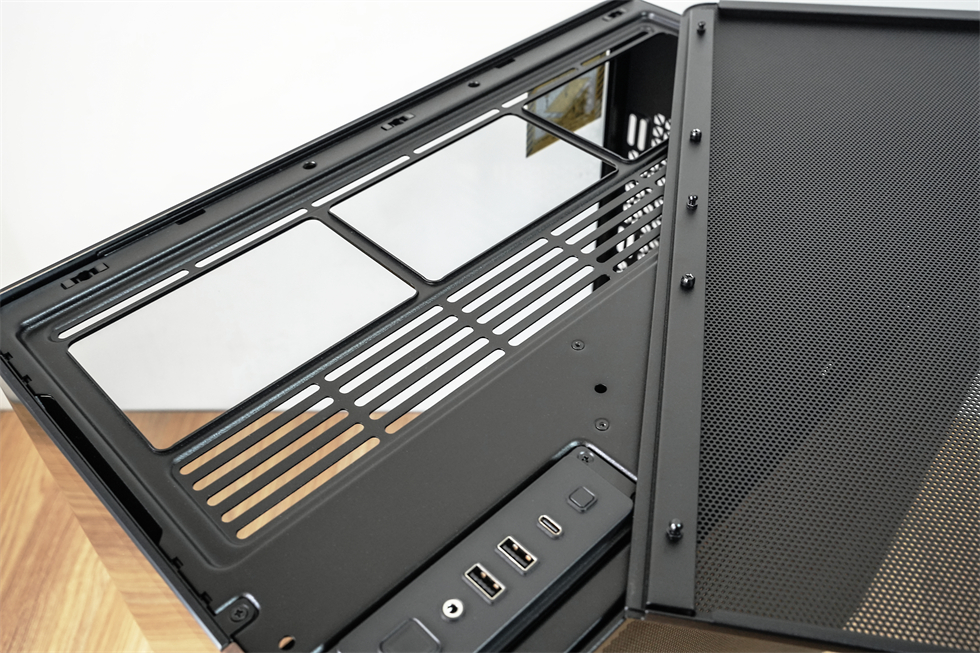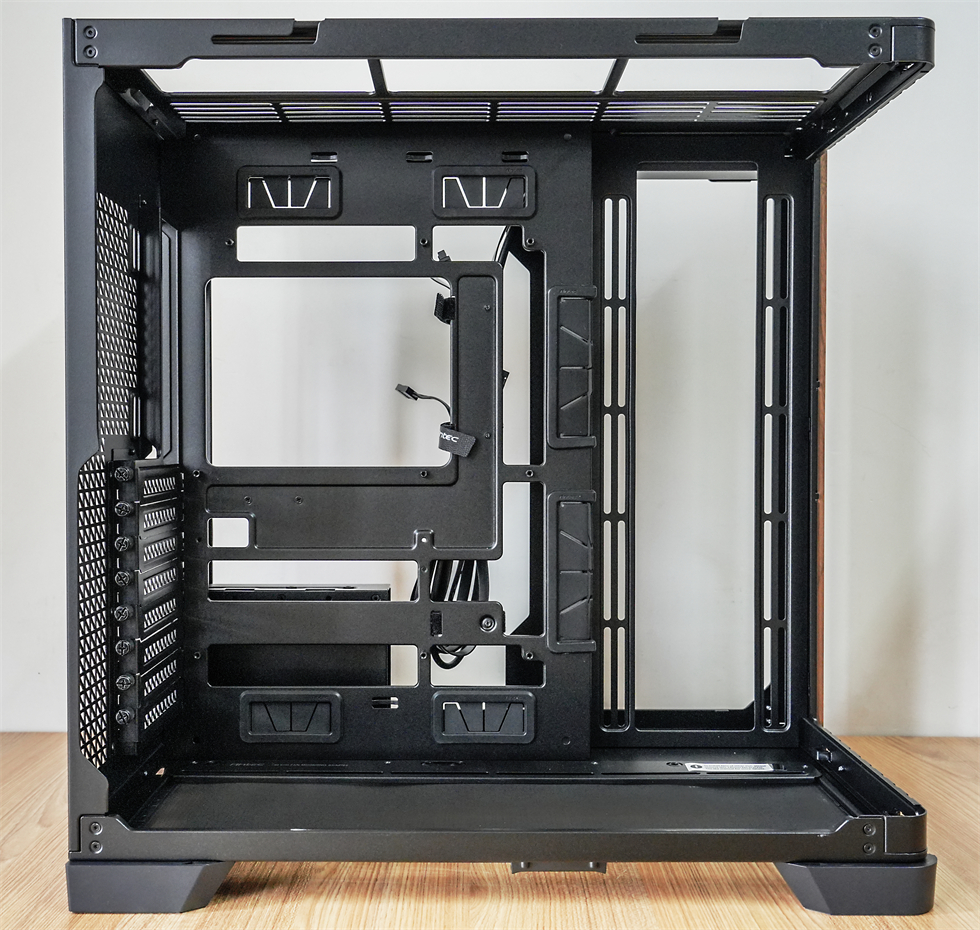 正面内部来一张,空间很宽裕,最大支持E-ATX主板,而且支持背插主板,顶部、底部和侧边都支持安装3×120mm风扇或是360mm冷排(顶部和底部支持140mm×3或160mm×2,侧面支持140mm×2),菊花位还能安装一个120mm风扇,10风扇共存轻松达成。
