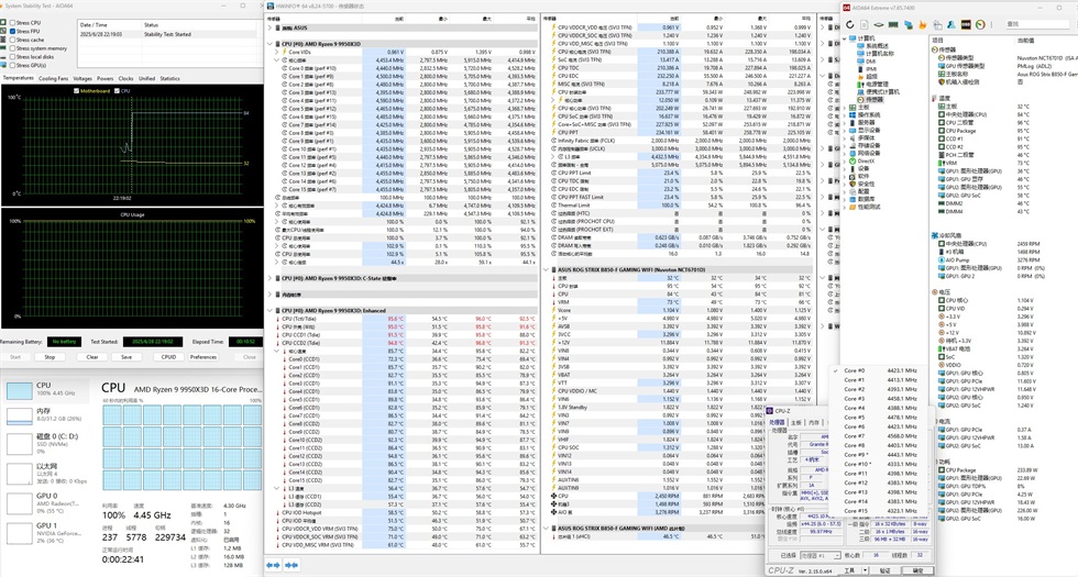 室温29℃,PBO拉满,单烤FPU,跑了13分钟温度稳定——CPU温度95.6℃、CPU核心95℃、CPU封装95℃,CPU功耗稳定在230W左右,CPU供电1.104V左右,频率全核4450MHz左右。