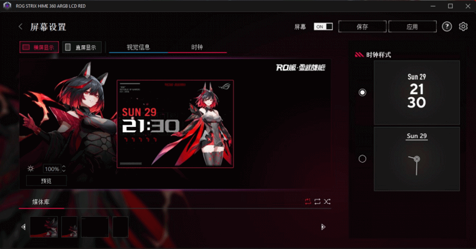 屏幕设置后,可以看到屏幕显示可分横屏和竖屏显示,主题切换、硬件信息和上传、预览等功能齐备,预置RO姬专属界面,硬件信息可随意根据自身需求选择显示。