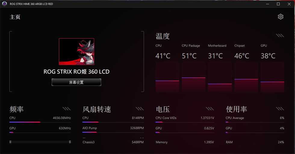 水冷驱动&测试RO姬360ARGB LCD水冷使用的全新ASUS info Hub控制软件,并没有整合到ROG的奥创中,主界面显示的是当前CPU和GPU的温度、电压、频率、使用率等运行情况。