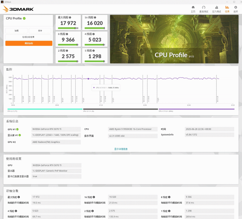 3DMARK CPU PROFILE测试,1线程1298,2线程2575,4线程5023,8线程9366,16线程16020,最大线程17972;3DMARK Time Spy测试,分数25511,显卡分数28591,CPU分数15842;3DMARK Time Spy Extreme测试,分数13955,显卡分数13936,CPU分数14067;3DMARK Fire Strike测试,分数53014,显卡分数64774,物理分数48772,综合分数23761;3DMARK Fire Strike Extreme测试,分数35045,显卡分数36689,物理分数48365,综合分数20037;3DMARK Fire Strike Ultra测试,分数18526,显卡分数18788,物理分数48386,综合分数9126;3DMARK Steel Nomad测试,分数7034,显卡测试70.35FPS;3DMARK PORT ROYAL测试,显卡分数19836;3DMARK DLSS测试也跑了一下,DLSS关闭43.38FPS,DLSS开启163.15FPS。