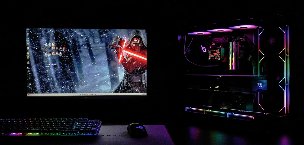 金色装饰件搭配带ARGB灯效的启世之环信仰灯,颜值不错。