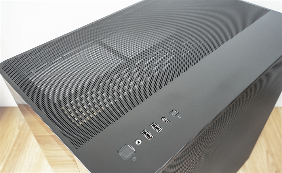 I/O区有开关键、耳机/麦克接口、2×USB3.0 Type-A,1×USB Type-C(10Gbps),重启键。