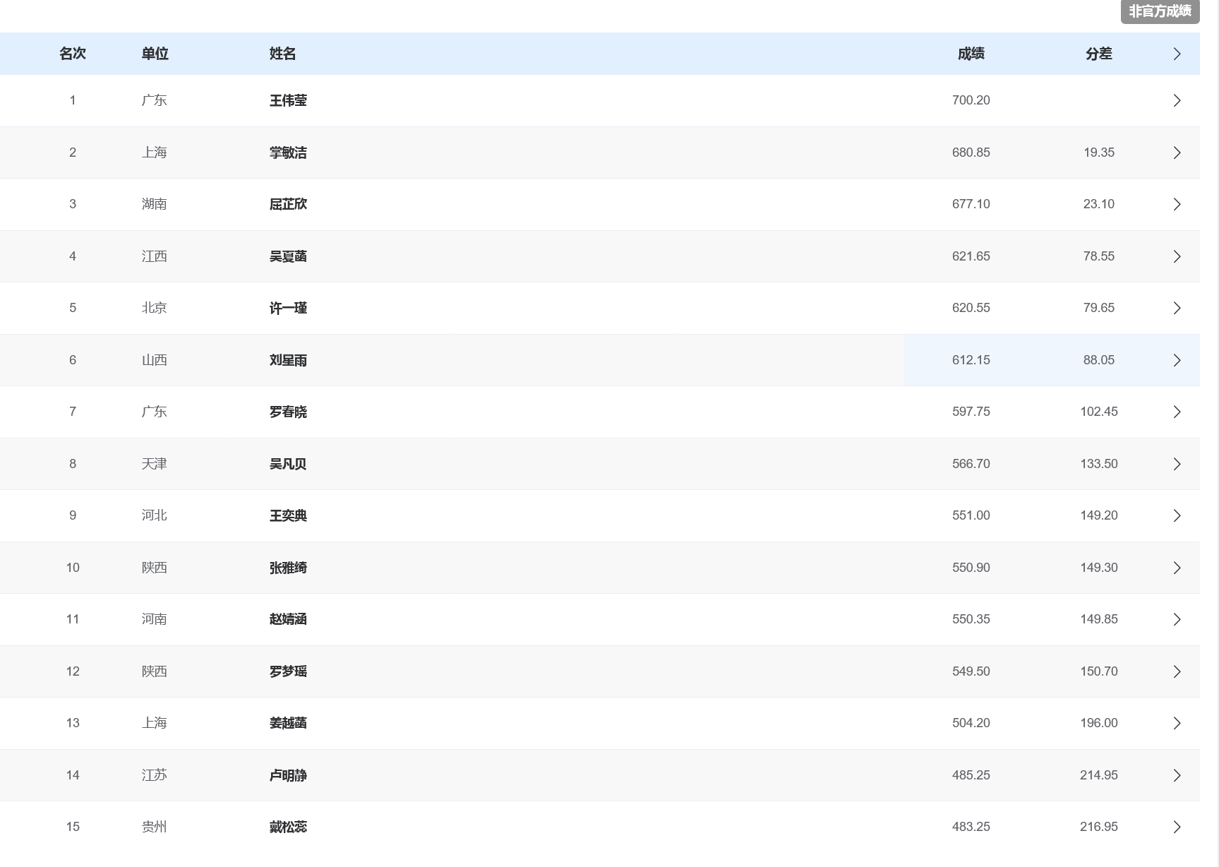 此役精彩角逐,广东选手王伟莹全场发挥稳定,以700.20分夺得金牌。此外,上海名将掌敏洁680.85分获得银牌,湖南选手屈芷欣677.10分获得铜牌。