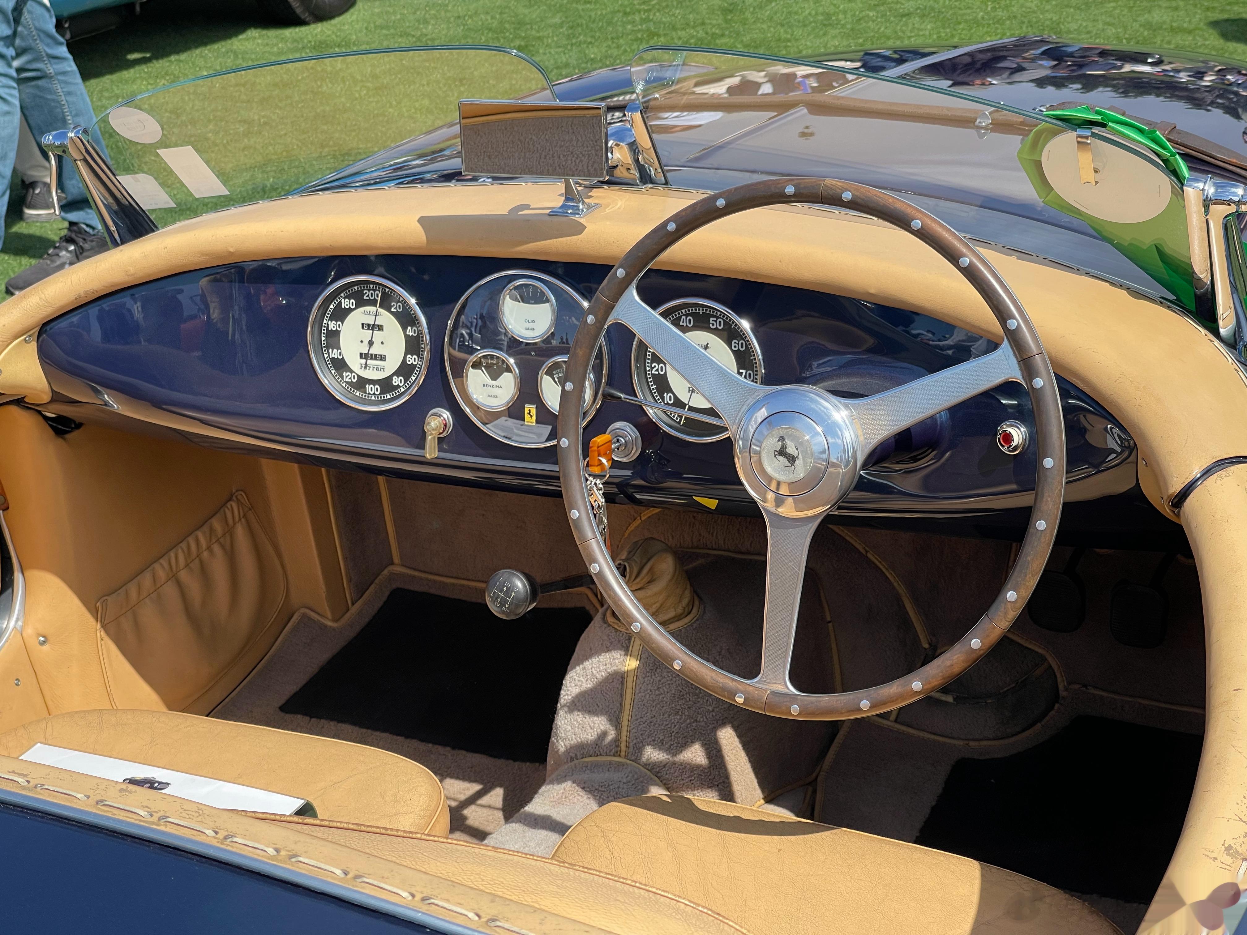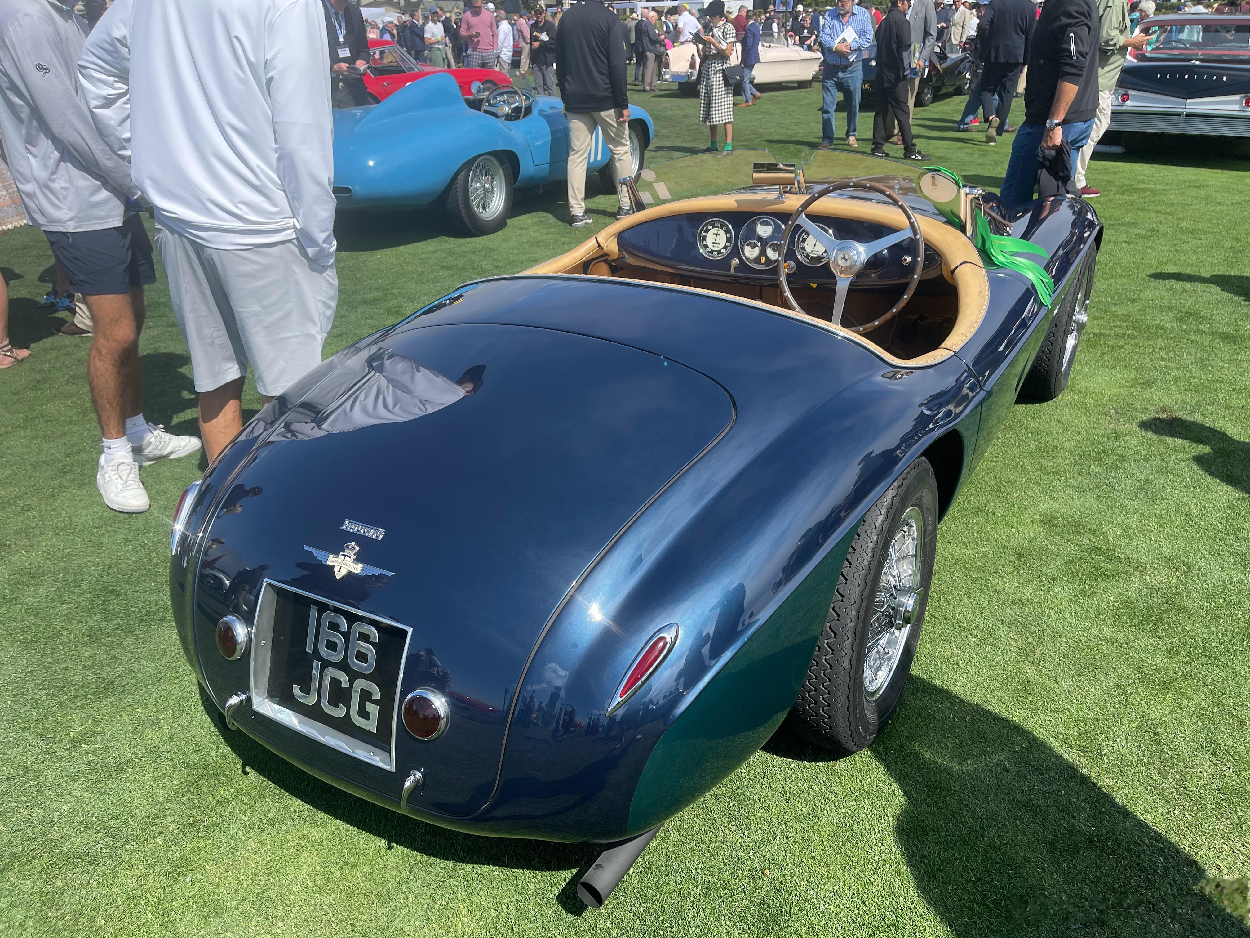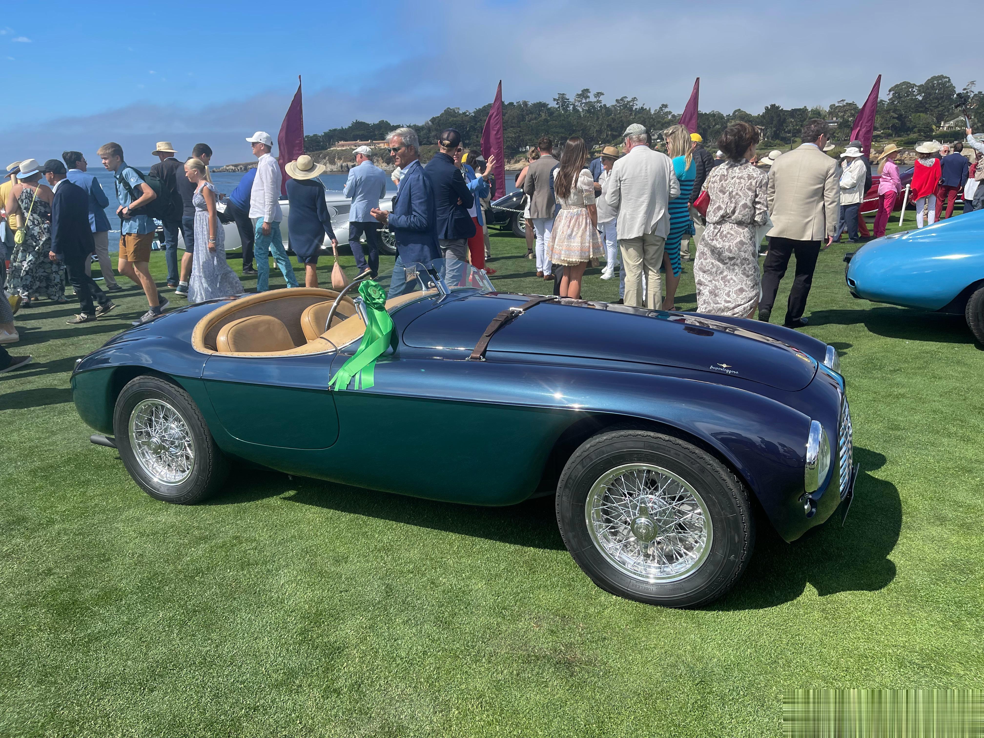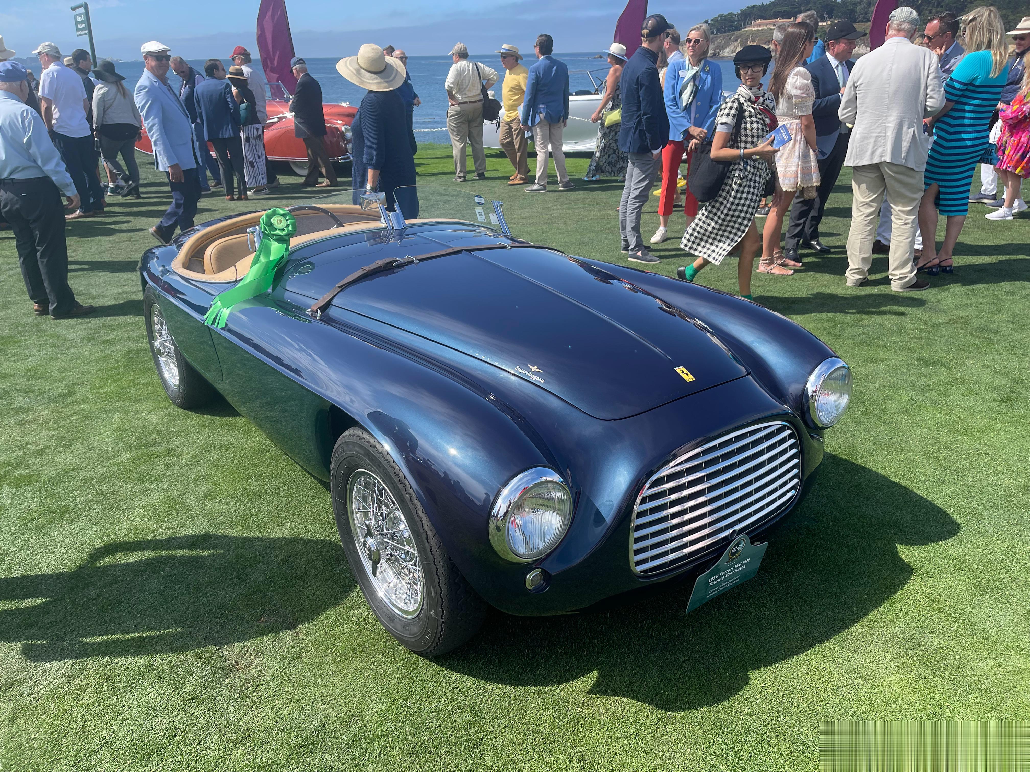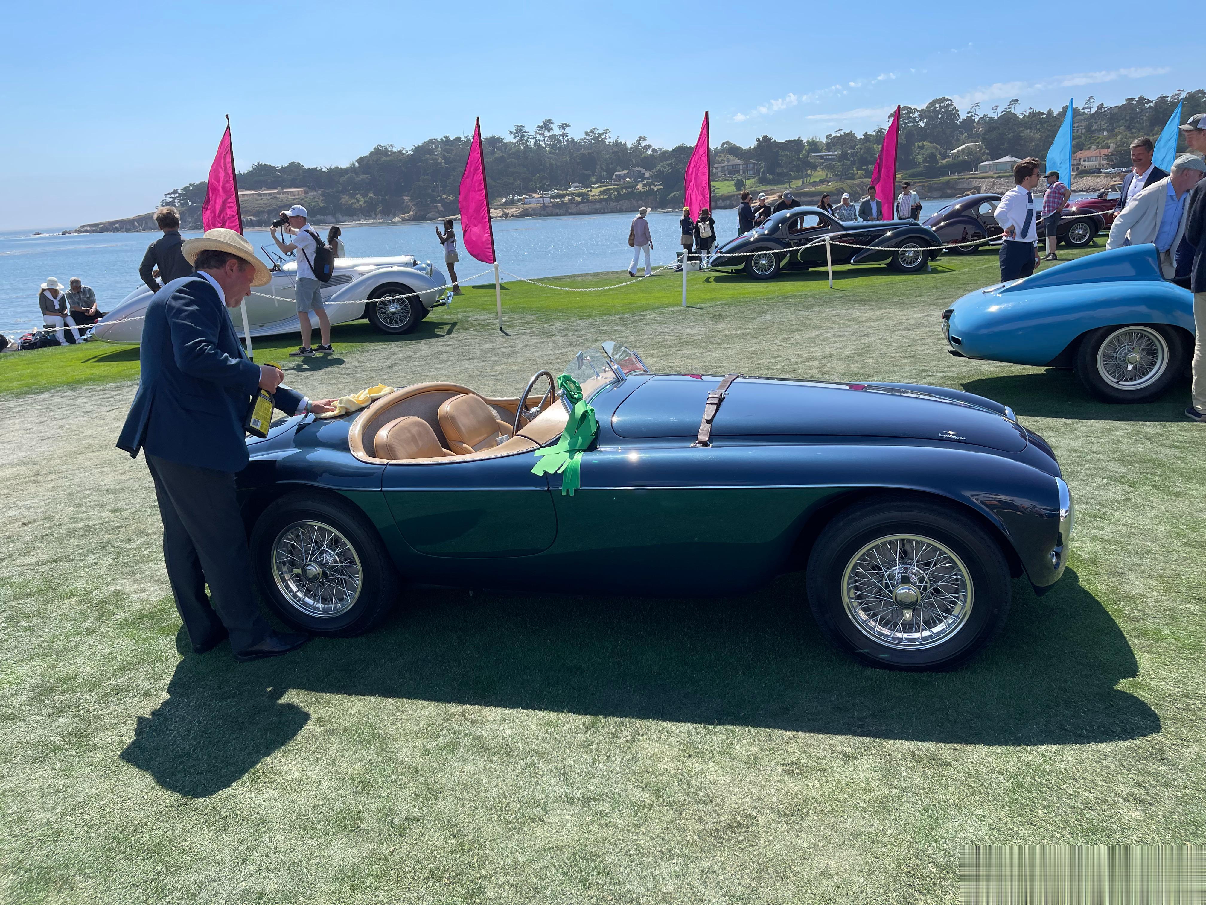 一名老大爷正在擦拭他的166 MM 0064 M,曾经是菲亚特掌门人Gianni Agnelli的座驾,蓝绿拼色车身非常漂亮。