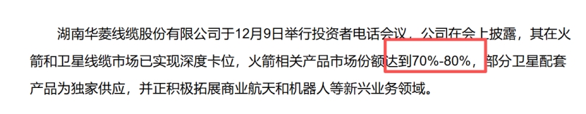 商业航天隐形冠军:公司在最新的投资者电话会议中表示,公司在火箭和卫星线缆市场已实现深度卡位,火箭相关产品市场份额达到70%-80%,部分卫星配套产品为独家供应,并正积极拓展商业航天和机器人等新兴业务领域。