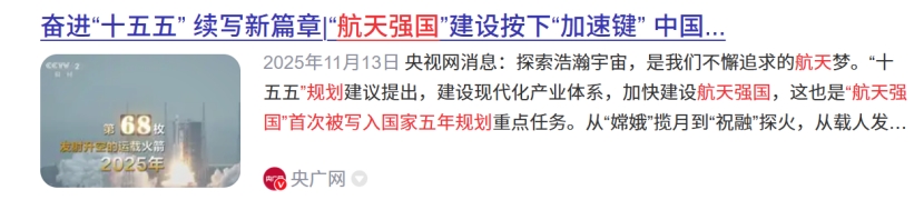 其次,商业航天从2024 年政府工作报告首次将商业航天定位为 “新增长引擎”,到“十五五”规划建议明确提出“建设现代化产业体系,加快建设航天强国”,这是“航天强国”首次被写入国家五年规划重点任务。这意味着商业航天已经上升到国家顶级战略高度。