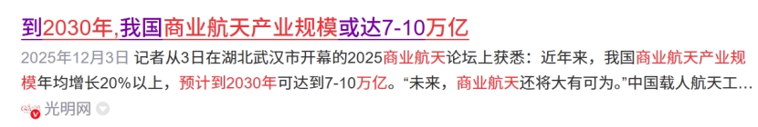 根据12月3日在湖北武汉市开幕的2025商业航天论坛上的预测,我国商业航天产业规模预计到2030年可达到7-10万亿。