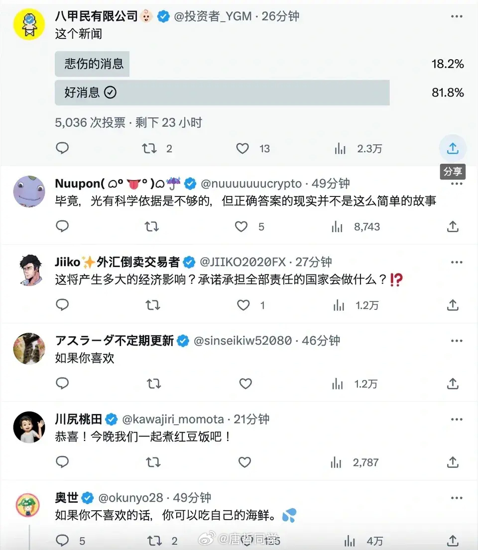 愿晴空万里 2023-08-27 03:52 对于普通日本人来说并没有什么影响,对于仇中日本人来说不来往更好,所以现在只有跟我们有直接利益的农民,渔民,外贸有关的部门才会头疼,财政收入缩水短时间内是看不出问题的,等他们的物价飞涨,货币贬值的时候,才会知道自己想错了。