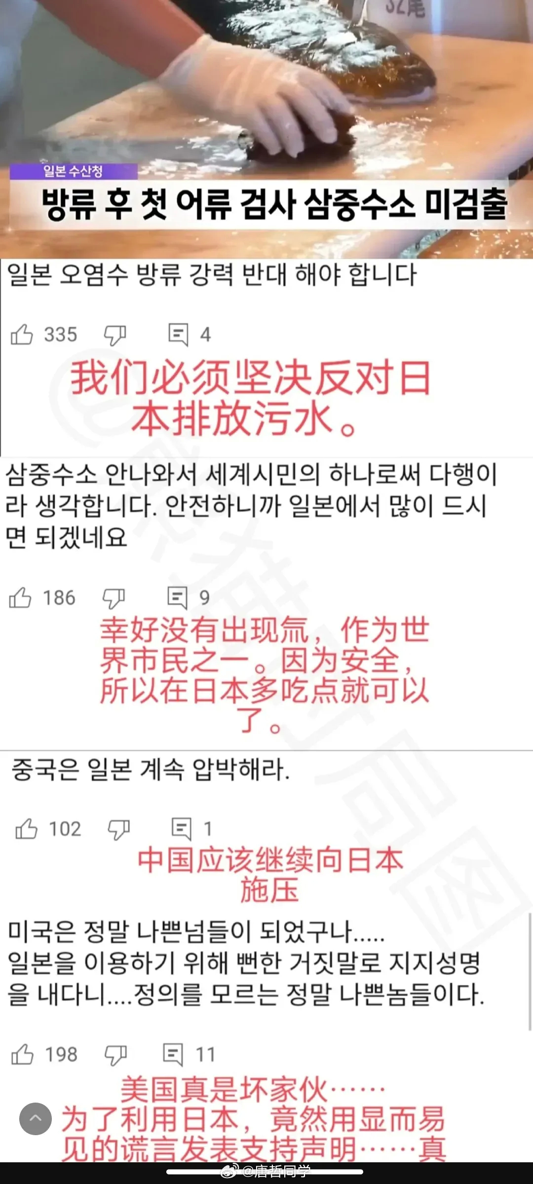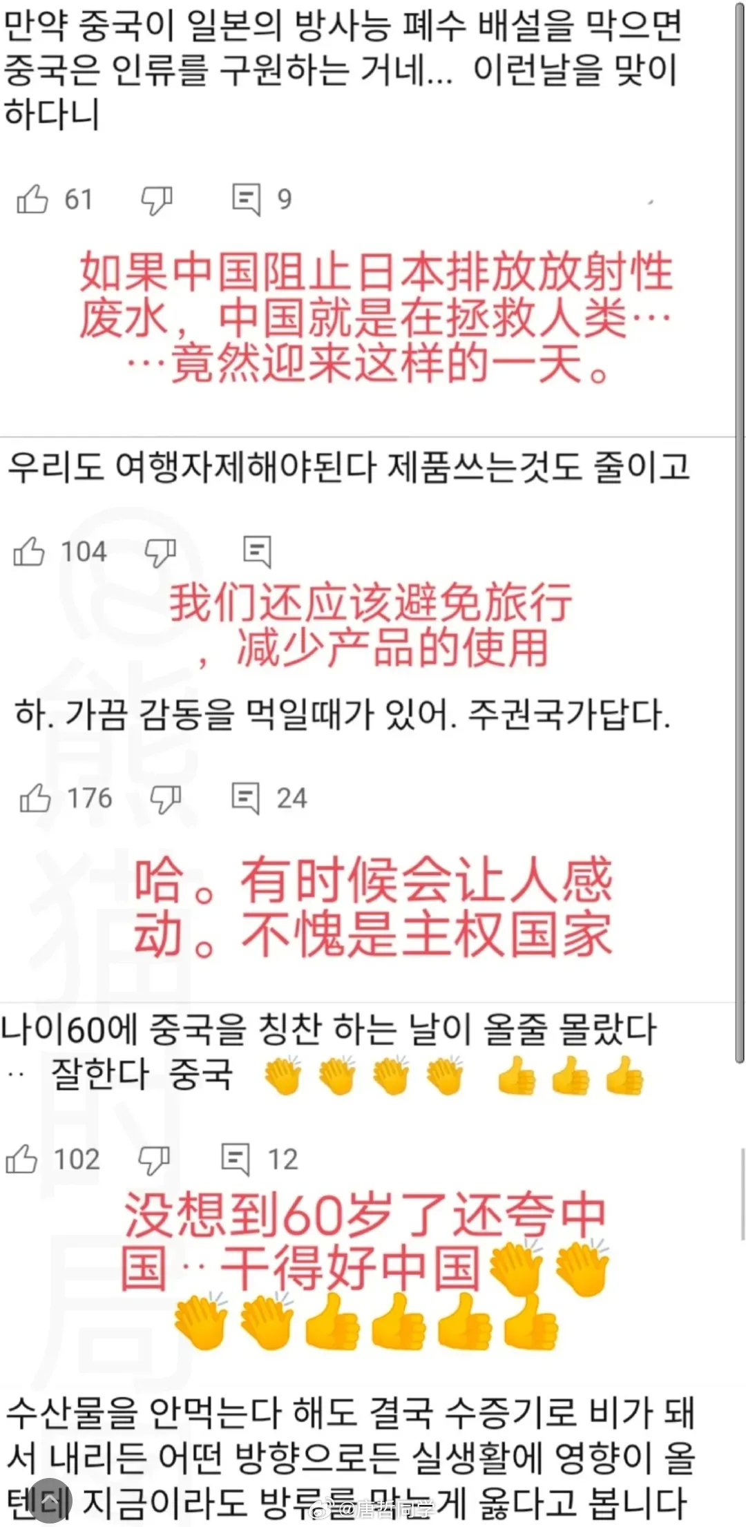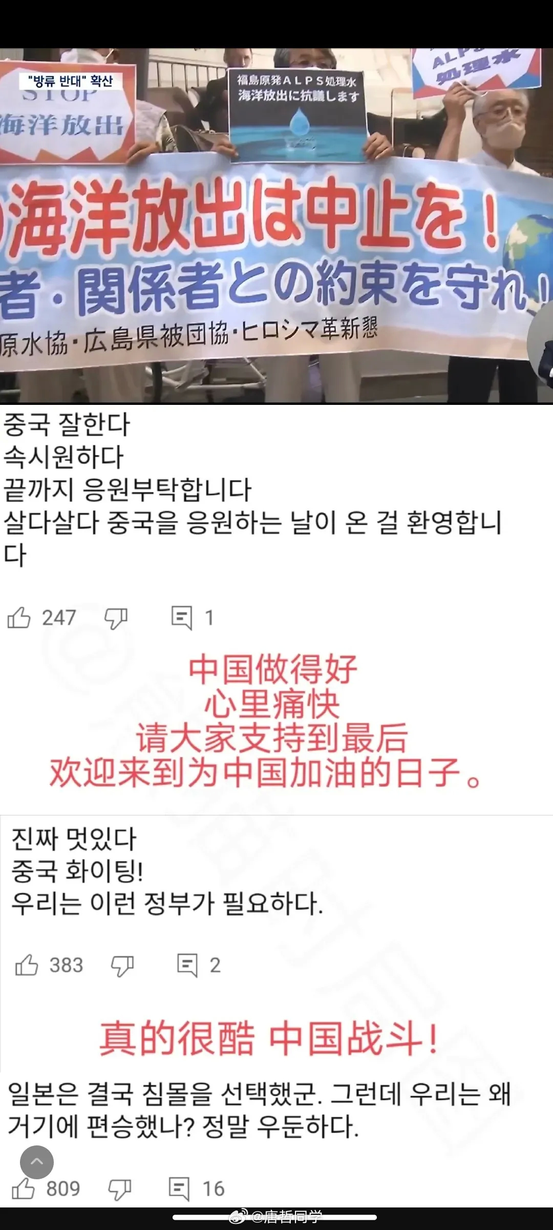 而这次韩国人在日本核污水排海问题上,没想到特别的支持中国,出人意料又在情理之中。毕竟靠海吃海嘛。他们纷纷评论, “中国做得好!” “好羡慕!”