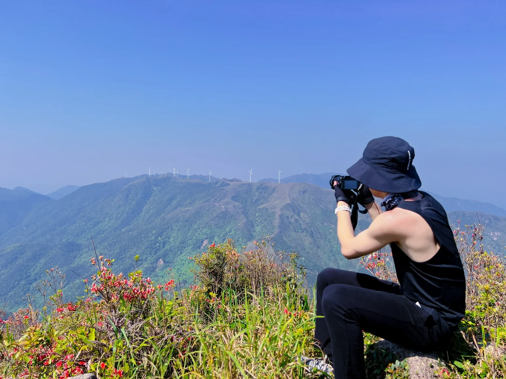 一路走上海拔最高的天露山山峰,山顶能看到对面的风车山上风车慢慢转动。
