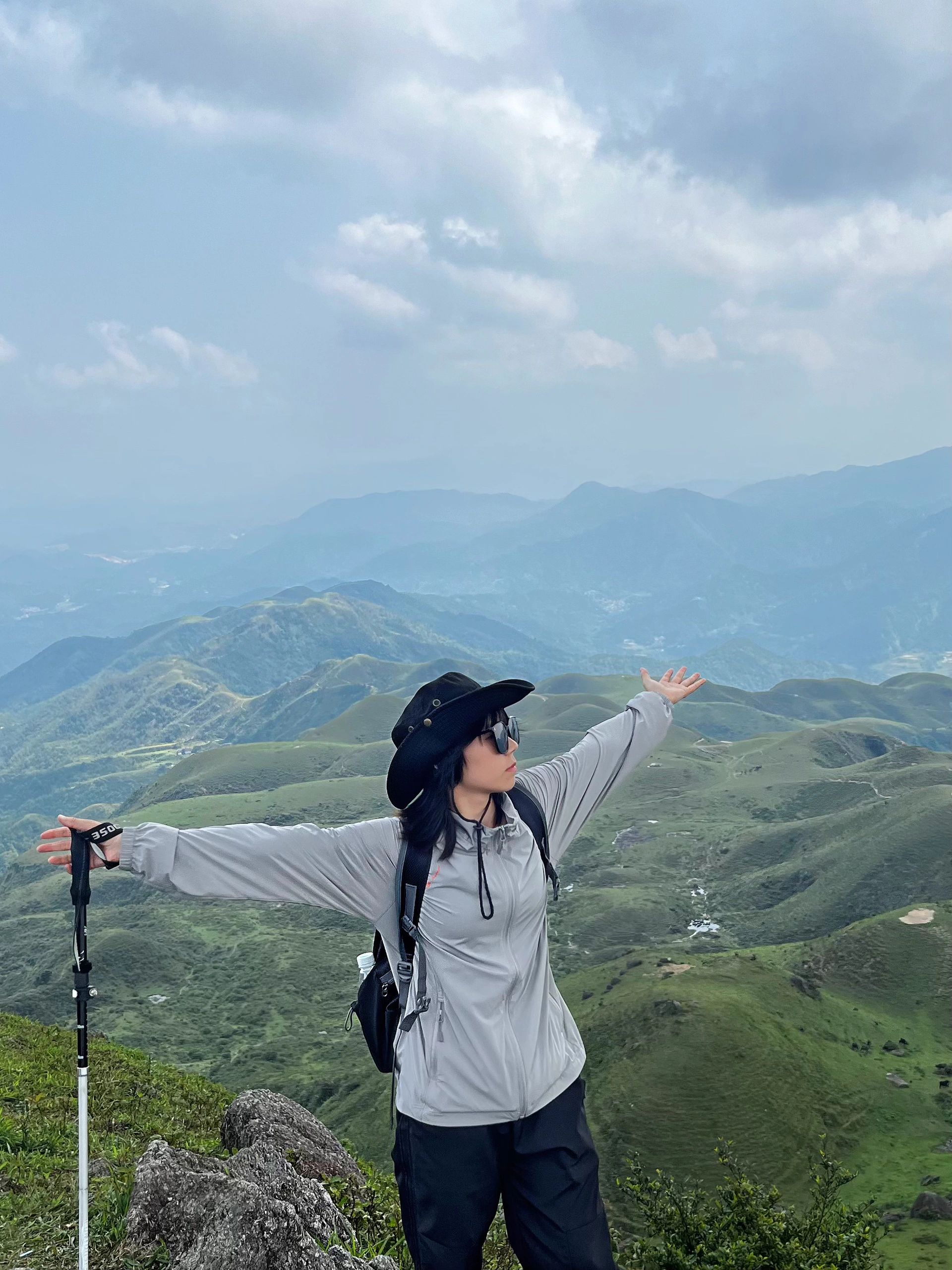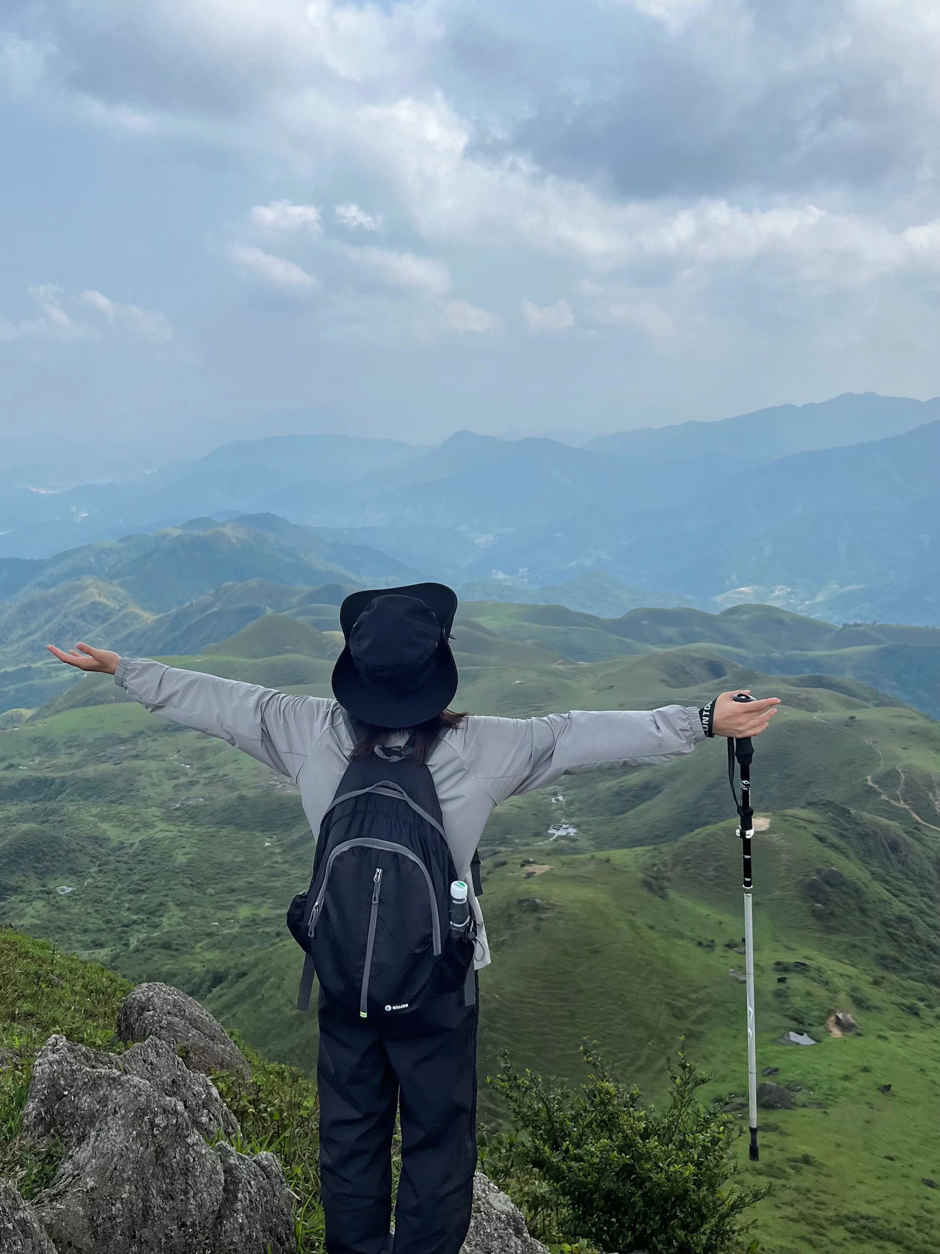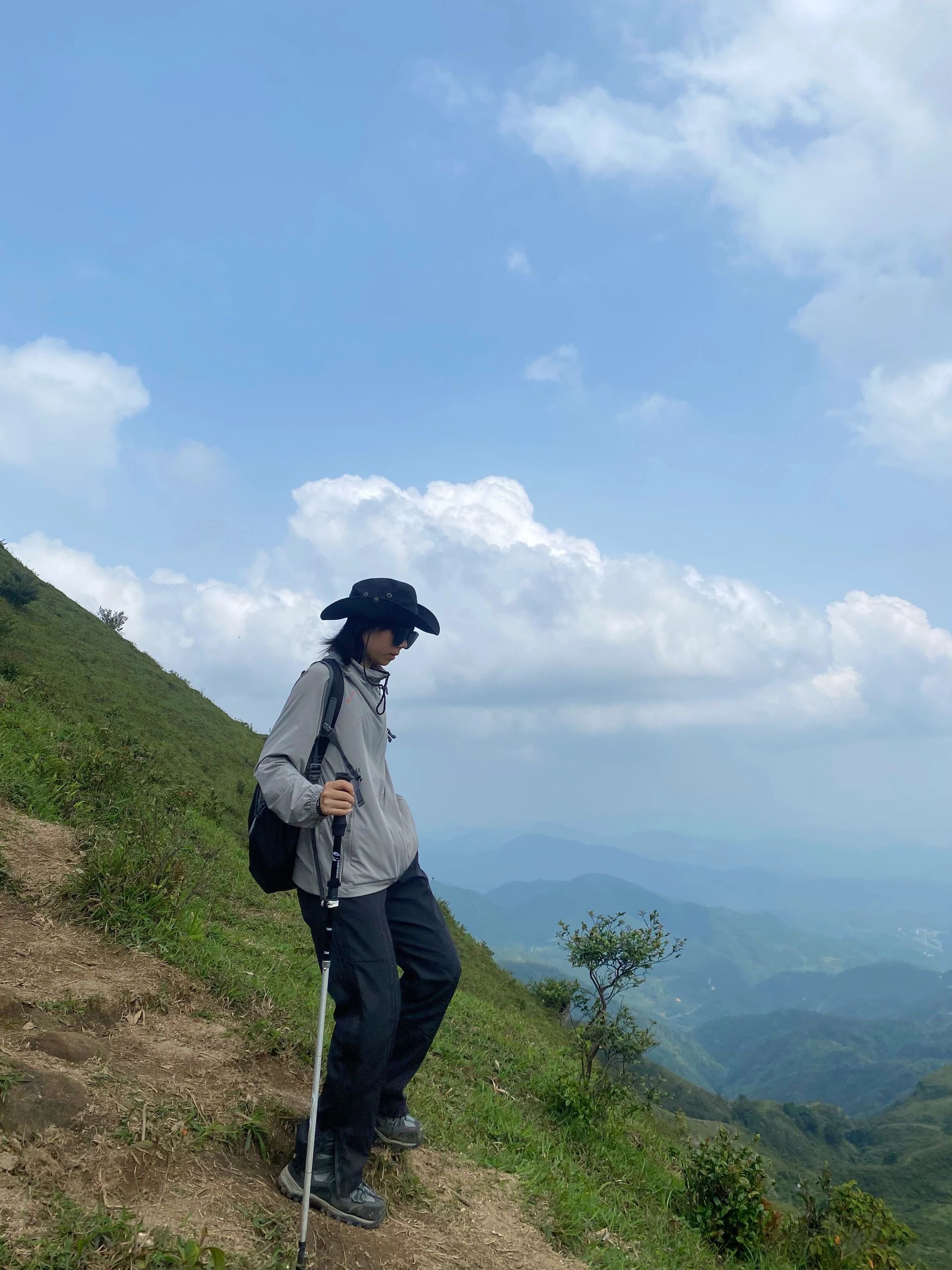 在停车场停车之后,有摩托佬问搭不搭车的,可以选择搭到露营地,露营地到顶要走一个小时的路程。 我们没选择搭,大学生主打就是省,走了一小段水泥路以后开始爬山,走山路的风景很好看,走水泥路的话比较陡。 我的装备:登山仗、登山鞋、护膝、登山帽、墨镜、两瓶水、湿巾和纸巾、垃圾袋、充电宝、一些零食。穿的是防晒衣 .