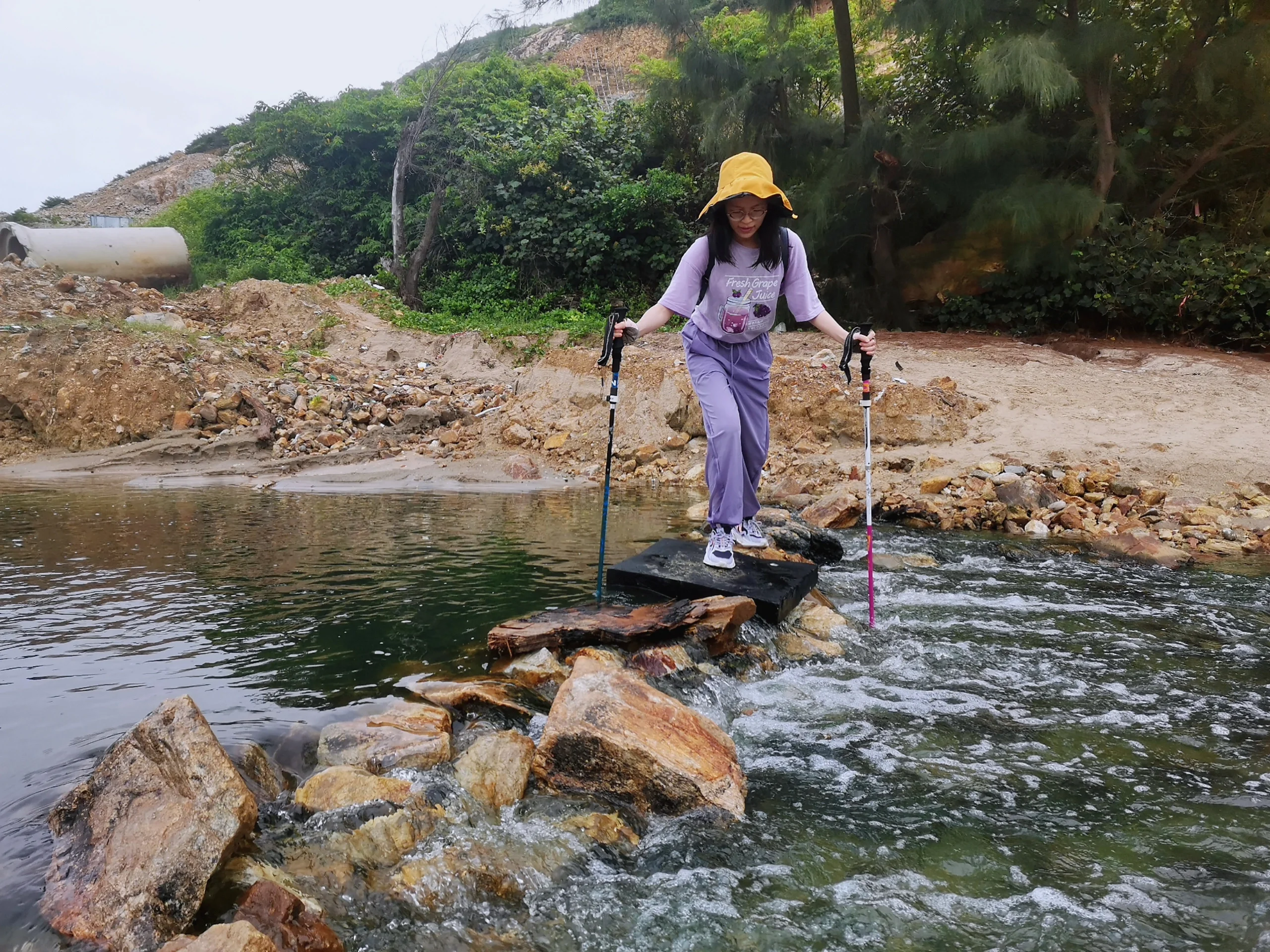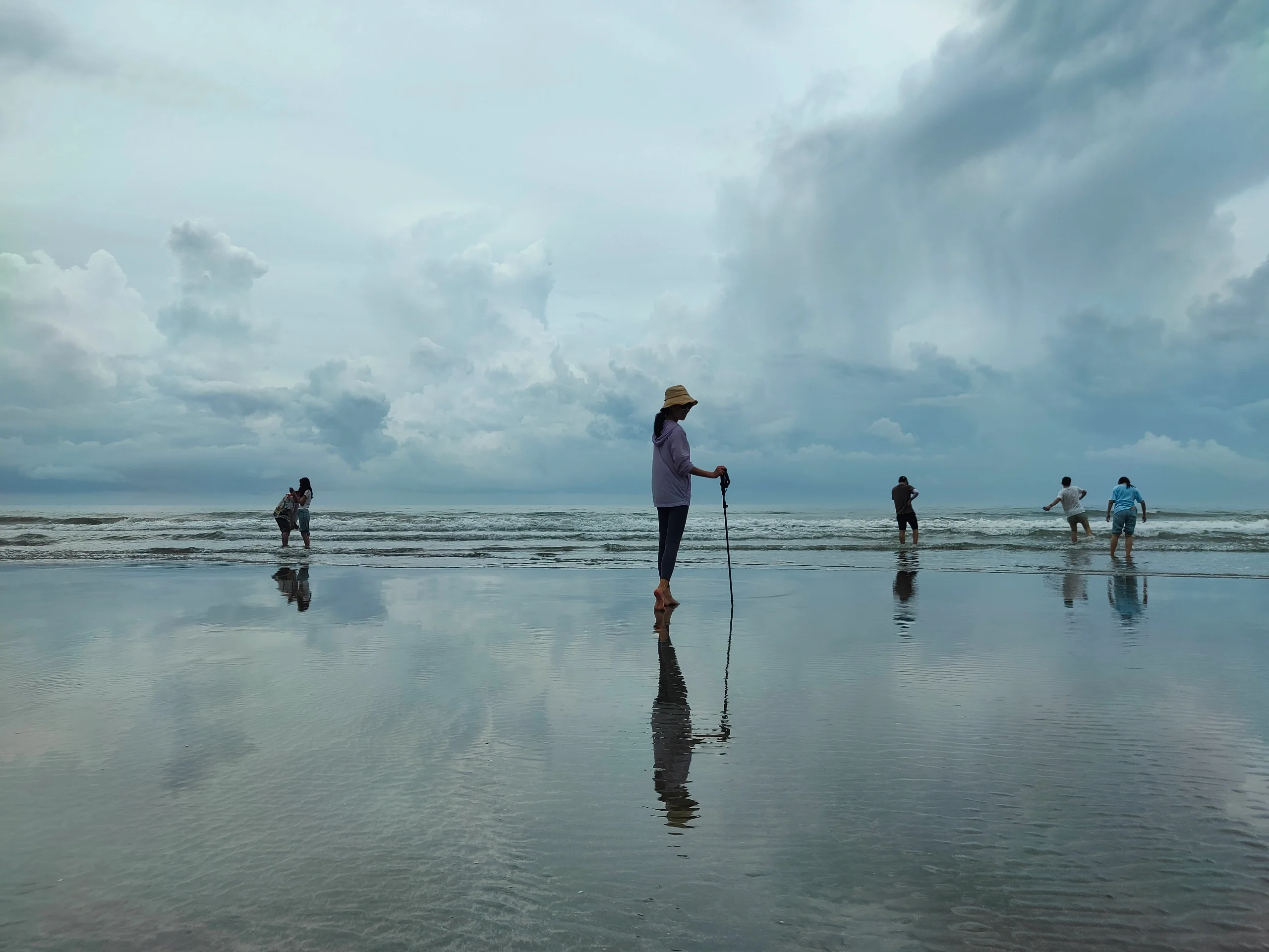 最后的最后,放下背包,脱下鞋袜,与大海来个亲密接触,登山杖秒变赶海棍。