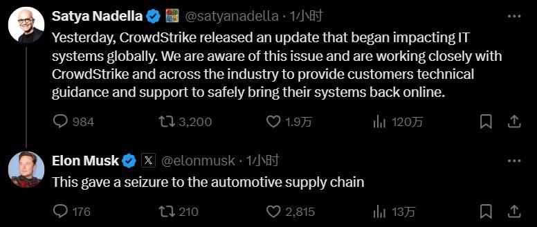 马斯克不仅在纳德拉关于“蓝屏事件”的声明下强势评论,还毫不留情地指出,“你们搞出的事情对汽车供应链造成了冲击”。他更是愤怒地形容此为“史上最大的 IT 失败”,并点名微软,配上生气表情。