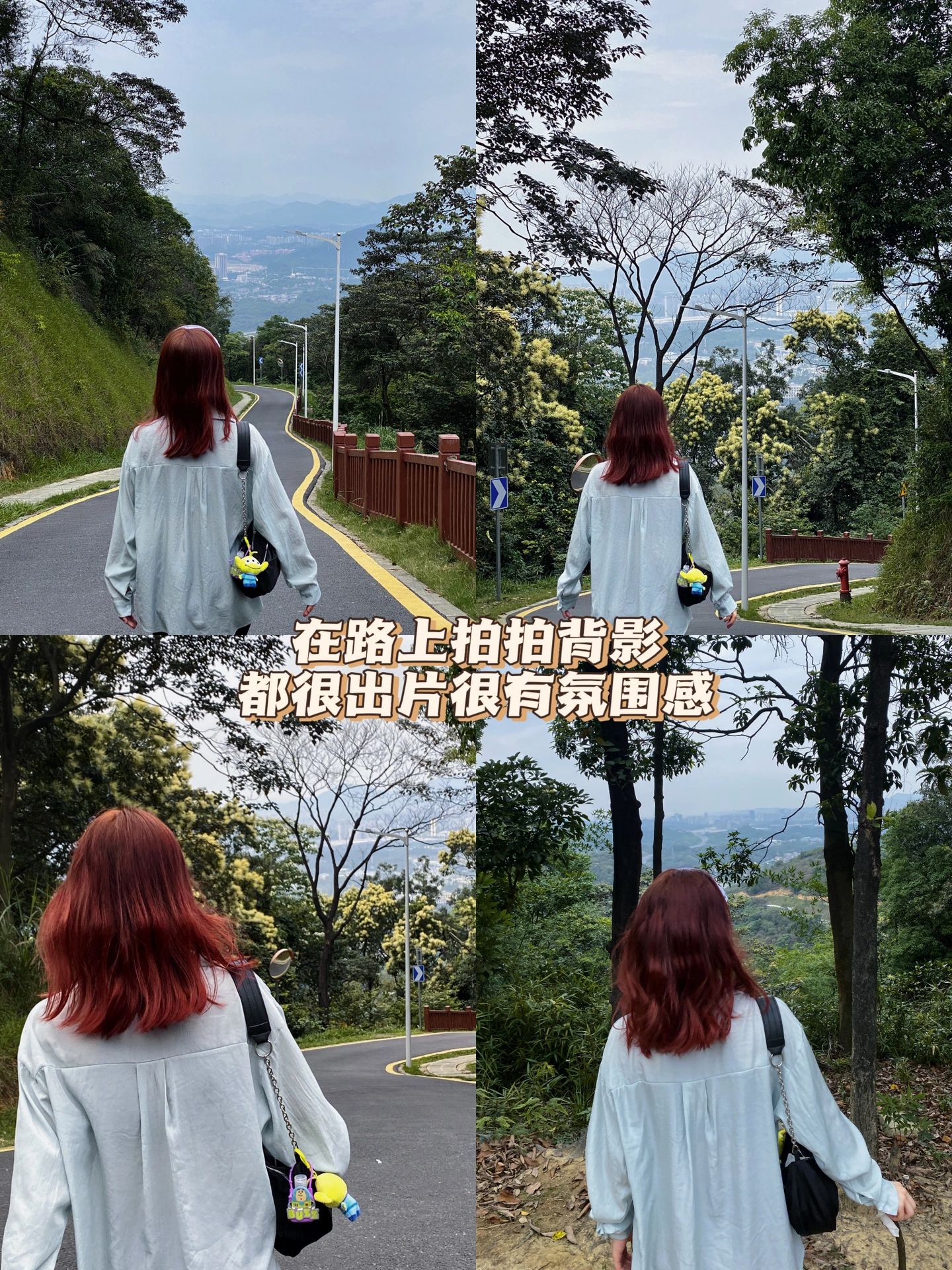 人直接站在路中间拍照就很出片,拍到城市和树林的对比也很有意思。