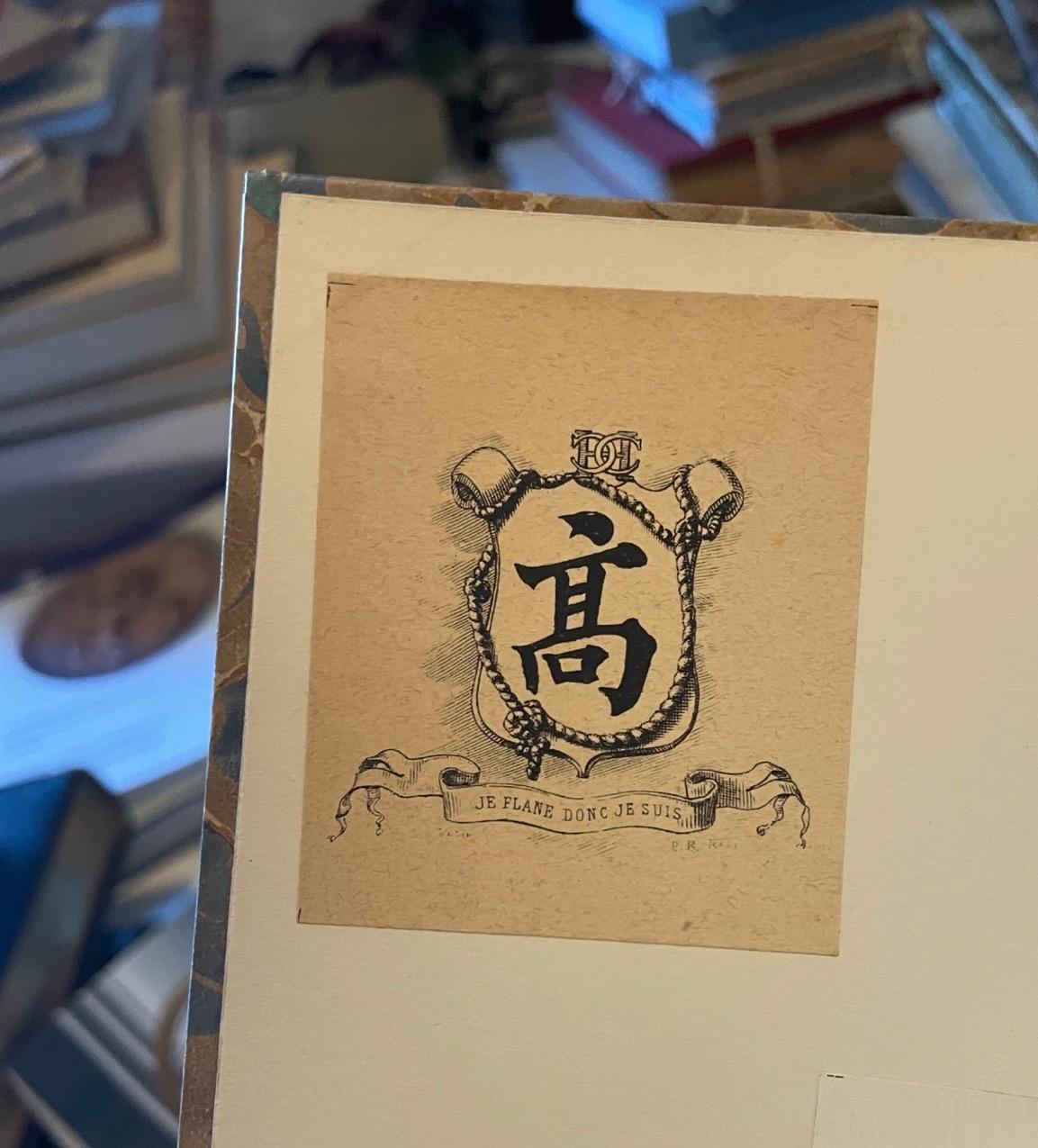 这是一本出自法国汉学名家考狄(Henri Cordier)旧藏的小书,里面他的藏书票上书有代表姓氏的“高”字,更为有趣的是徽记下方的格言“Je flâne donc je suis"(我逛故我在)。结合考狄本人曾在上海任职的经历,或许他也曾是city walk的重度爱好者:)