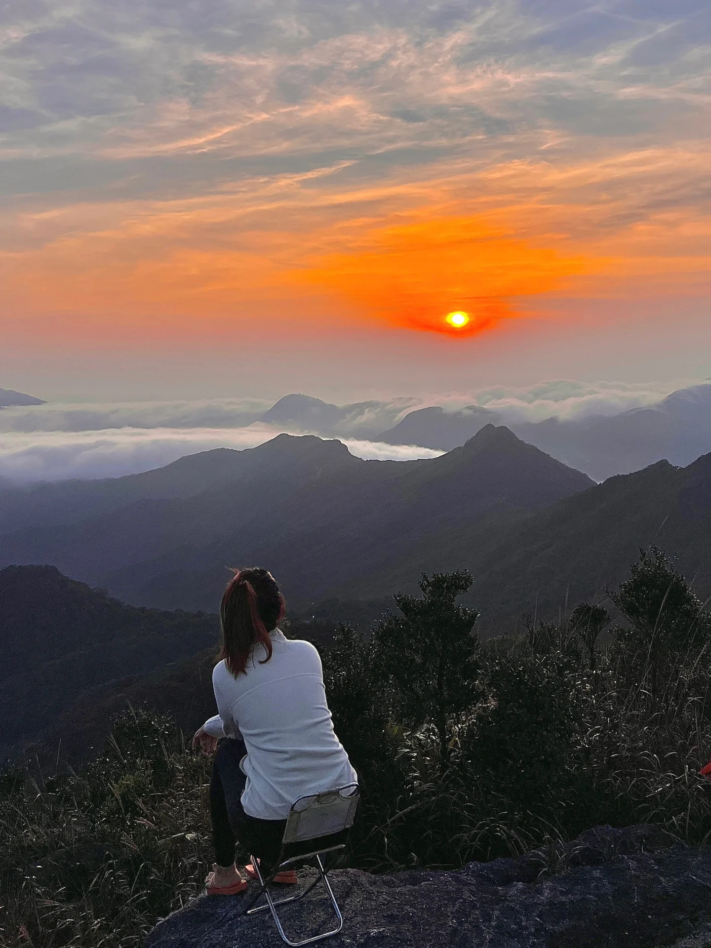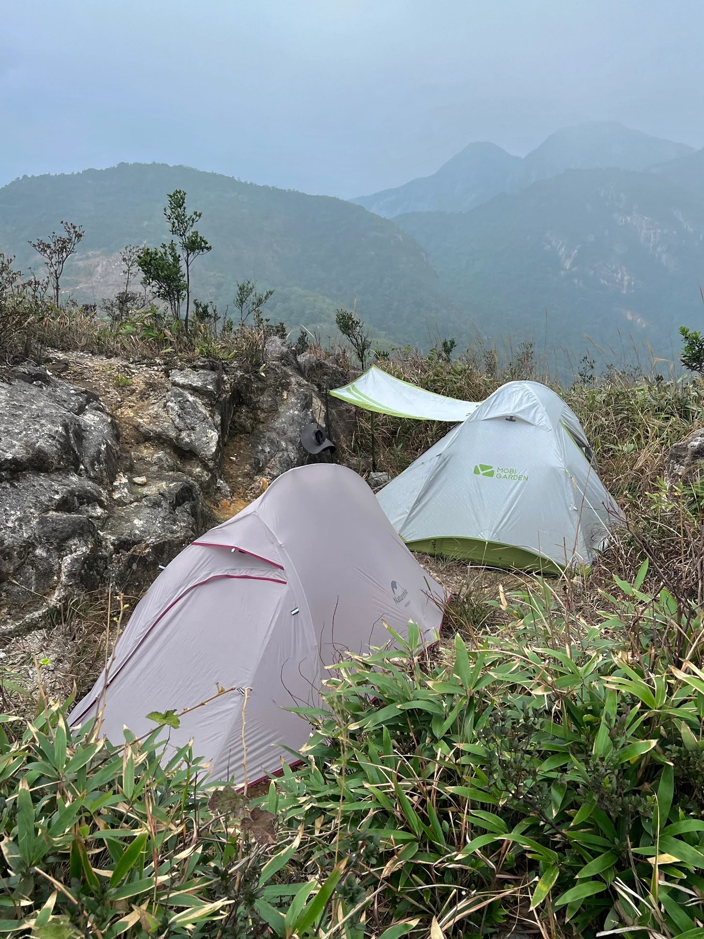 🔺第二天我们挪窝去第二峰,亭子在装修(略丑),人多很吵,看攻略别人都是搭帐篷在台阶上,考虑到周末搭在台阶上影响游客,家属发现有个凹地很适合,遮风一绝,有遮挡,比较隐私,半夜露水雾气很重,第三天的日出和云海惊艳到了,二峰距离水源处15分钟