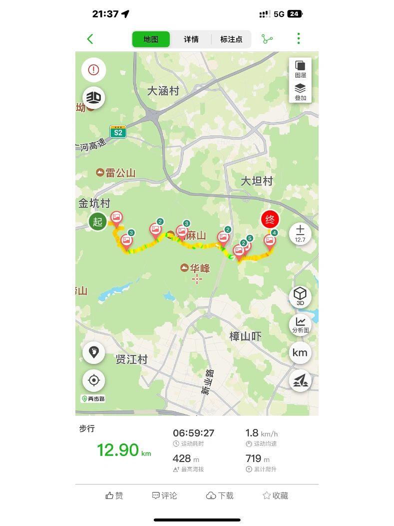 这条线路从金坑地铁站开始,途径油麻山顶和石牙顶天坑,最后在麦村结束,在麦村打车回镇龙西地铁站也比较方便。