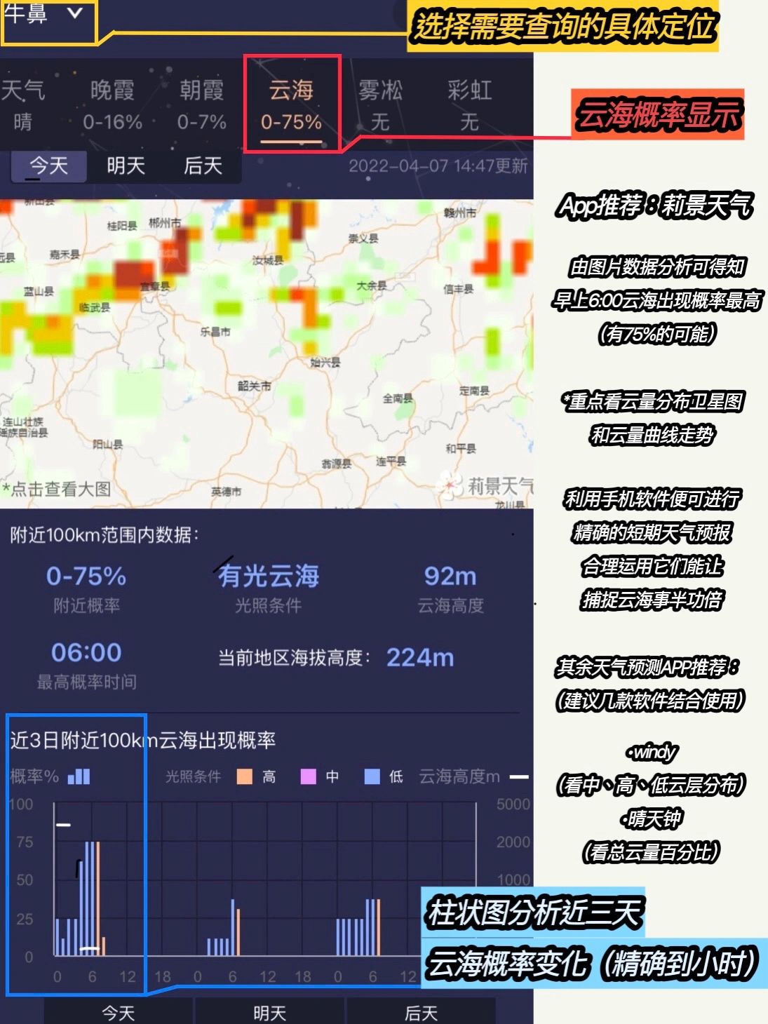 •利用手机软件和基本气象常识科学预测天气,预判云海概率(详情看图9)