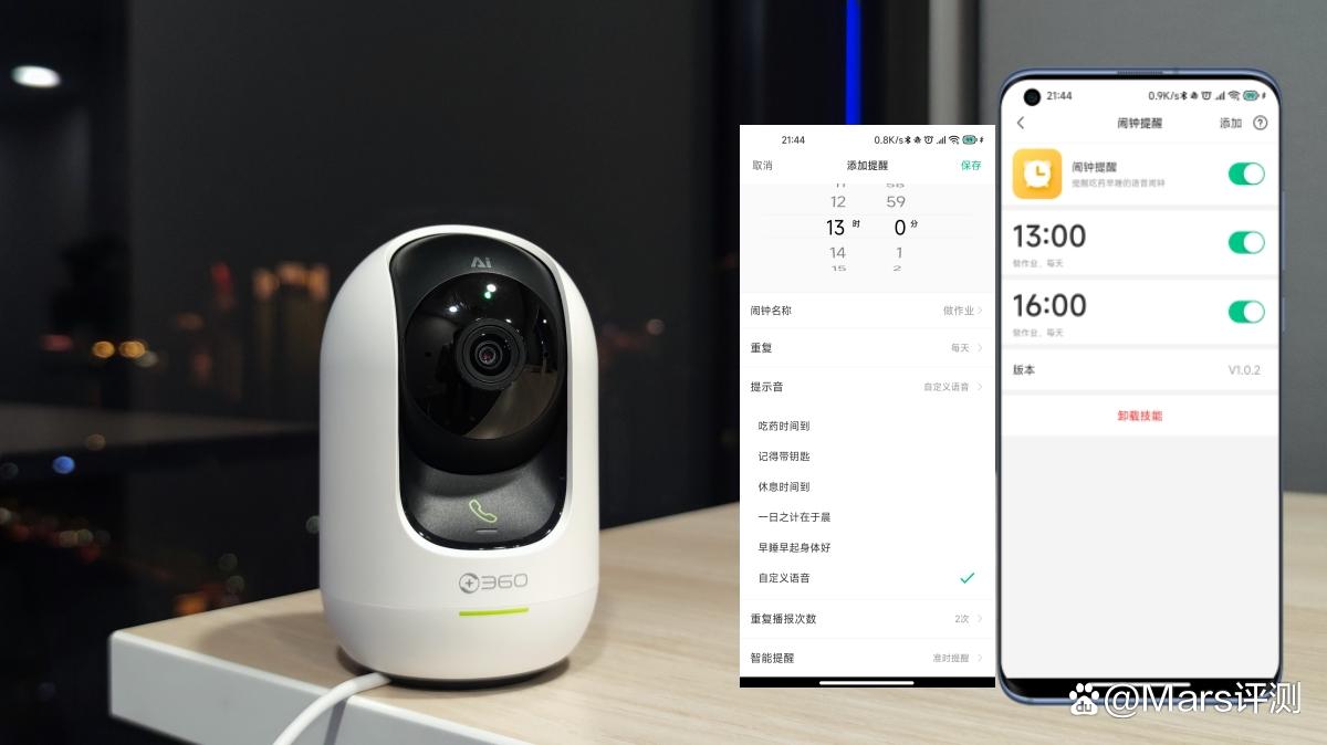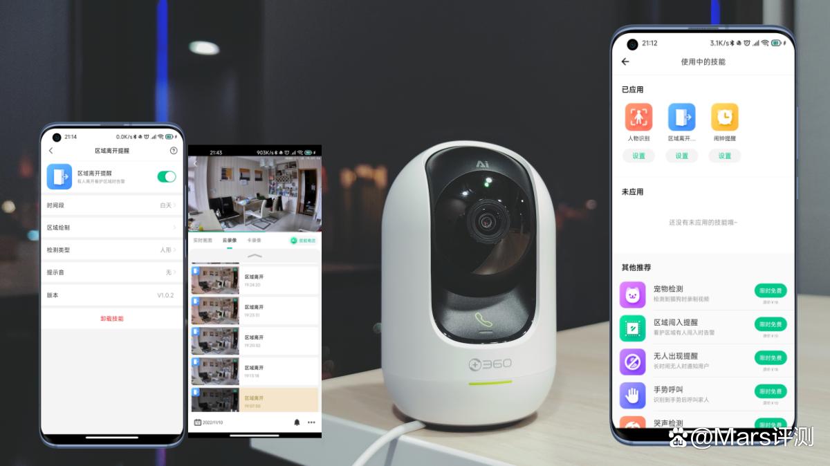 先说说“网课监督”,其实一般的百元价位的家用摄像头都能满足,我看很多用户也比较推荐上一代的产品7P。360 8MAX的另个优势就是AI的能力,具体什么芯片没有看。但是在功能支持方面还是比较全面的。分为4大场景8个AI技能,这里我用的是[区域离开提醒]和[闹钟提醒]。