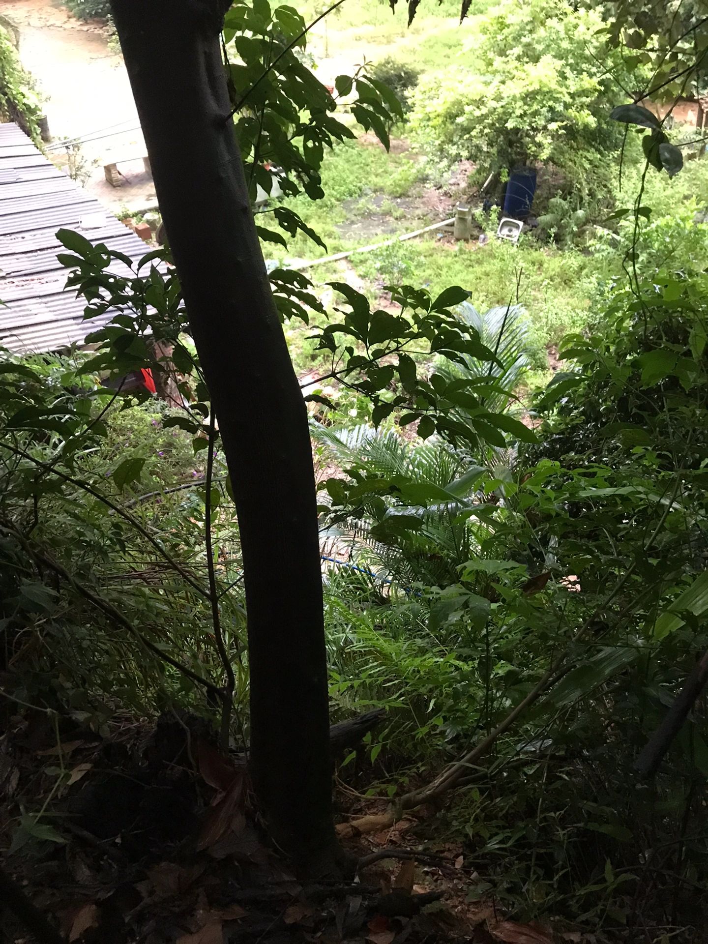 走了一段距离在到达山坟带处时,中雨变成暴雨,出于安全考虑,赶紧下到山下水库的房子避雨。