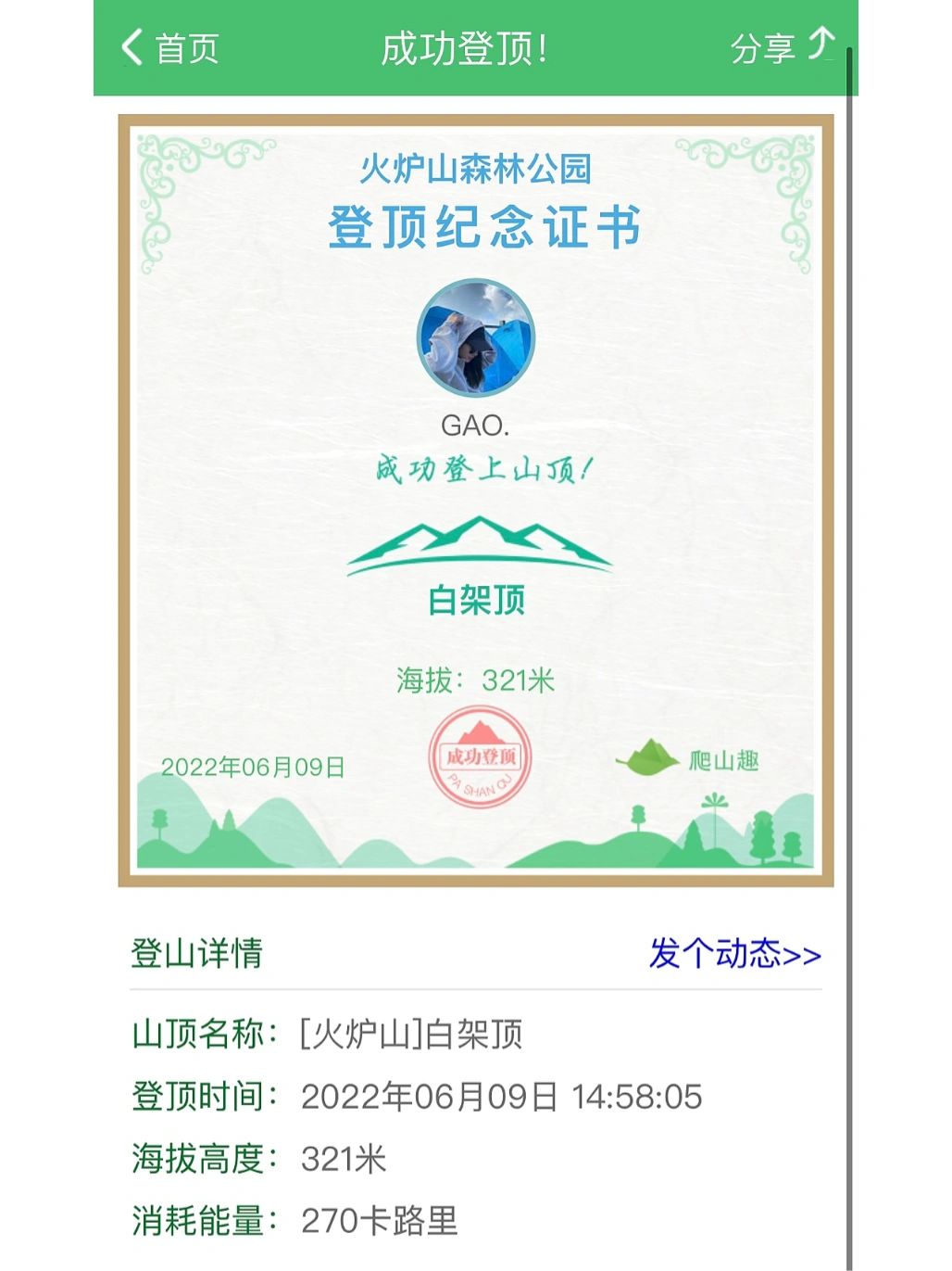 当时还因为啥都拍不到就扫了个登顶证书(图八)