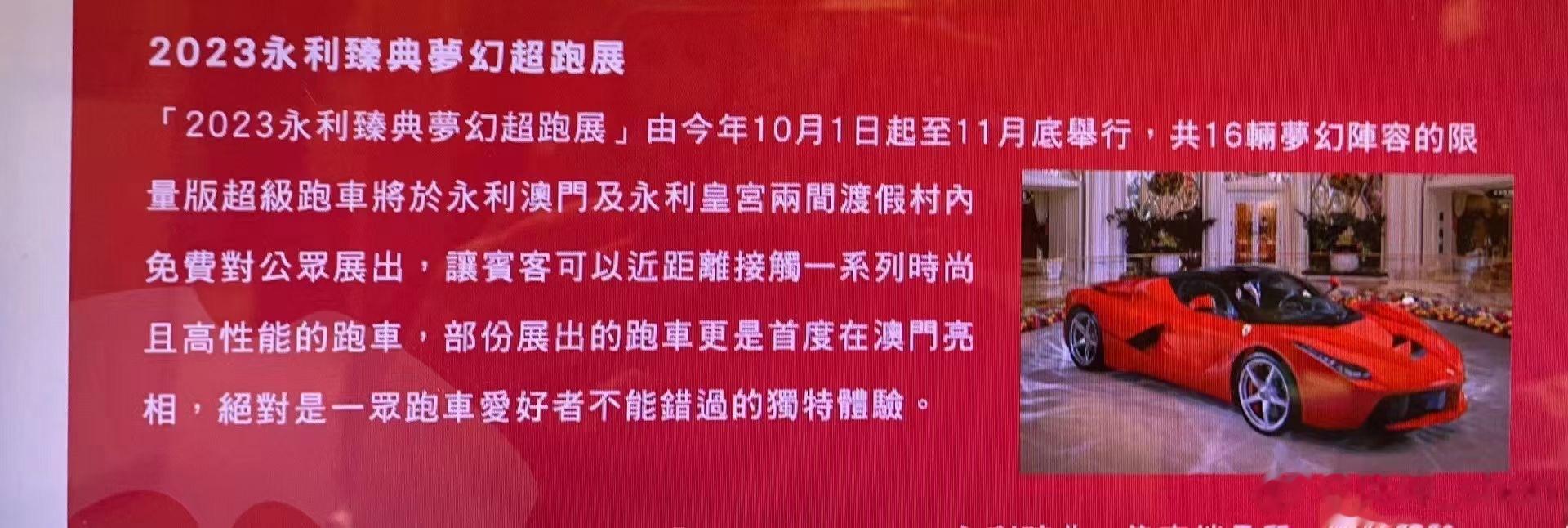 澳门永利的展览,持续两个月,从十一国庆节到11月澳门赛车节[哇]