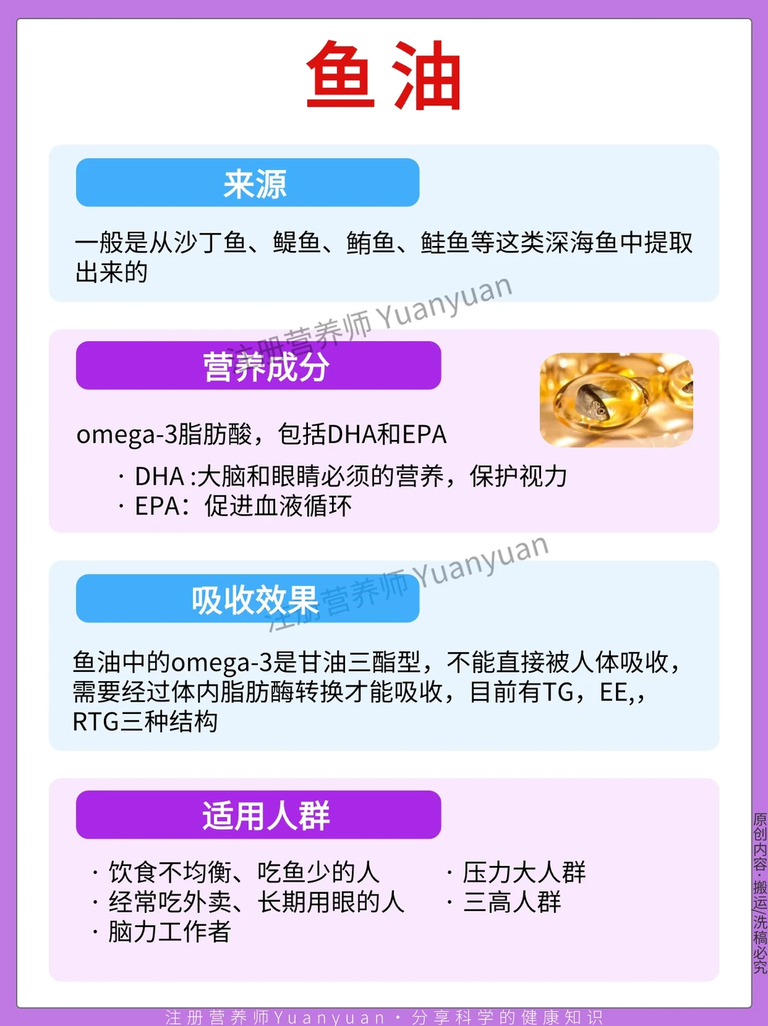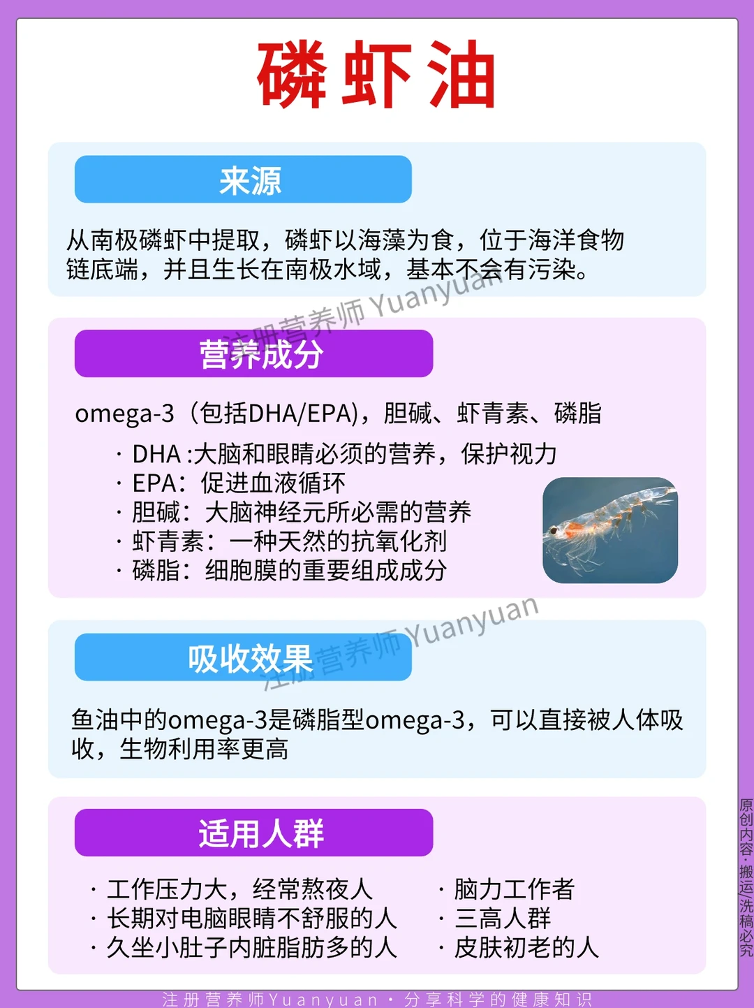 总的来说,它们都含有Omgea-3 (DHA、EPA),可以维持机体免疫功能,改善大脑技能,提高记忆力和学习能力,外卖党、熬夜加班党,职场脑力工作者、三高人群都可以吃,但是相对于鱼油磷虾油的吸收率远远高于鱼油👏👏~