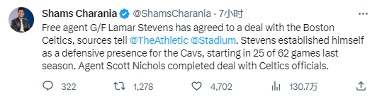 消息人士透露,自由球员前锋拉马尔·史蒂文斯已同意与波士顿凯尔特人队达成协议。史蒂文斯在上赛季的 62 场比赛中首发了 25 场,确立了自己在骑士队防守端的地位。经纪人斯科特·尼科尔斯与凯尔特人队官员完成了交易。